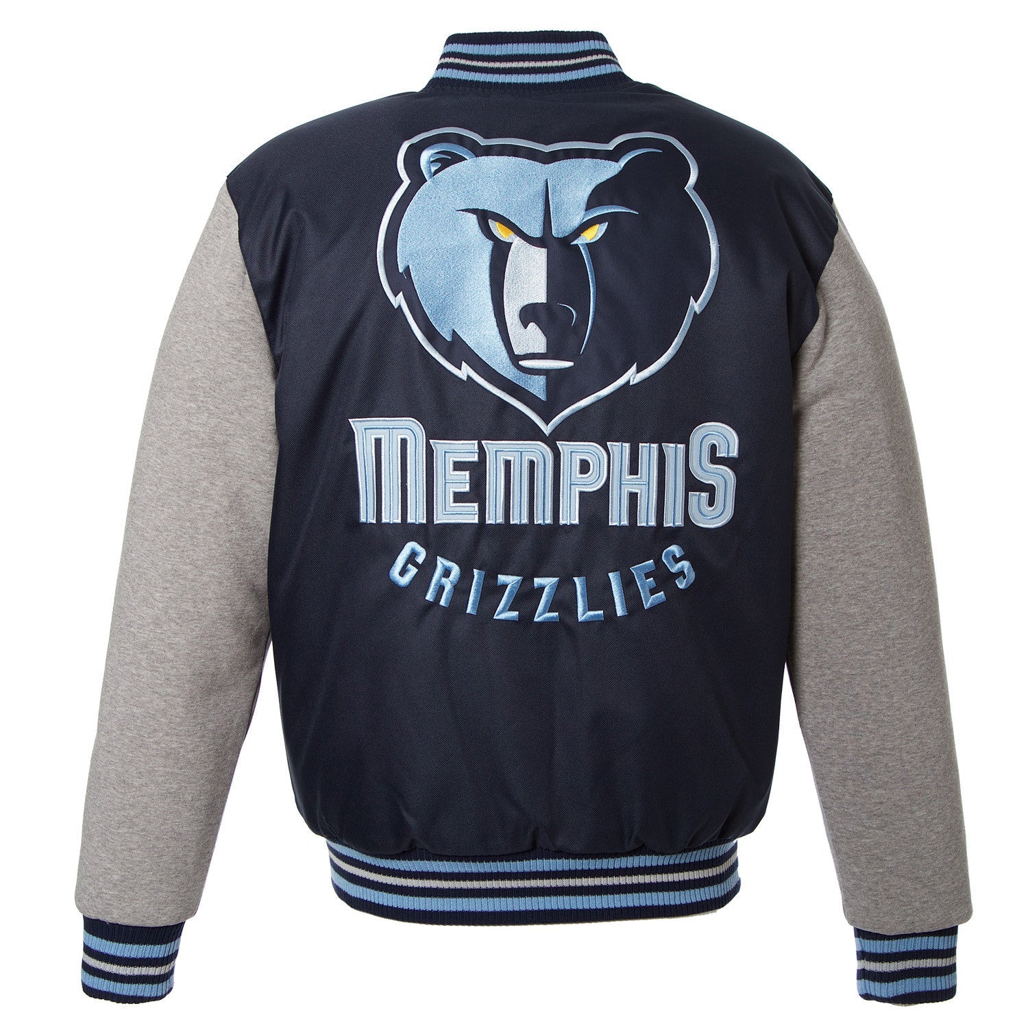 Memphis Grizzlies reversible polyester jacket in navy-gray with fleece sleeves and embroidered appliqué logos. Reverse side is nylon.