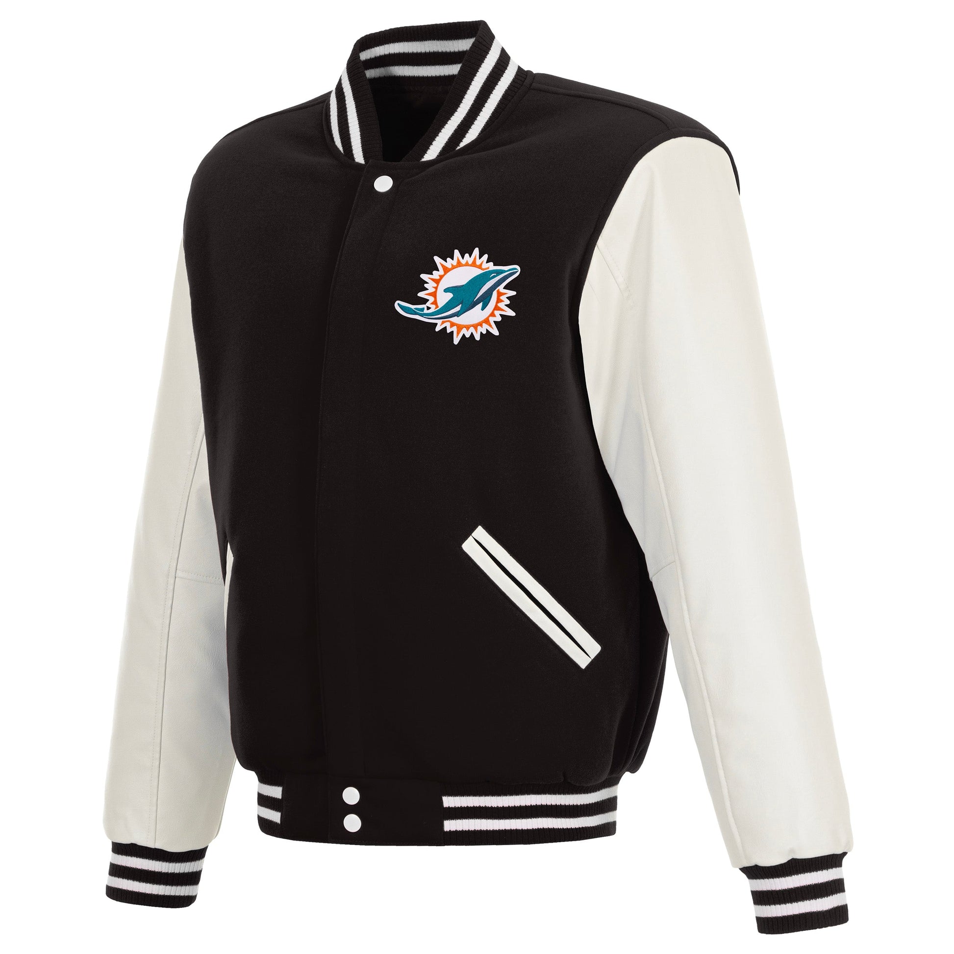 Miami Dolphins reversible fleece jacket with faux leather sleeves in black and white with embroidered logos. Assembled in the USA. 100% polyester body, faux leather sleeves, snap button closure.