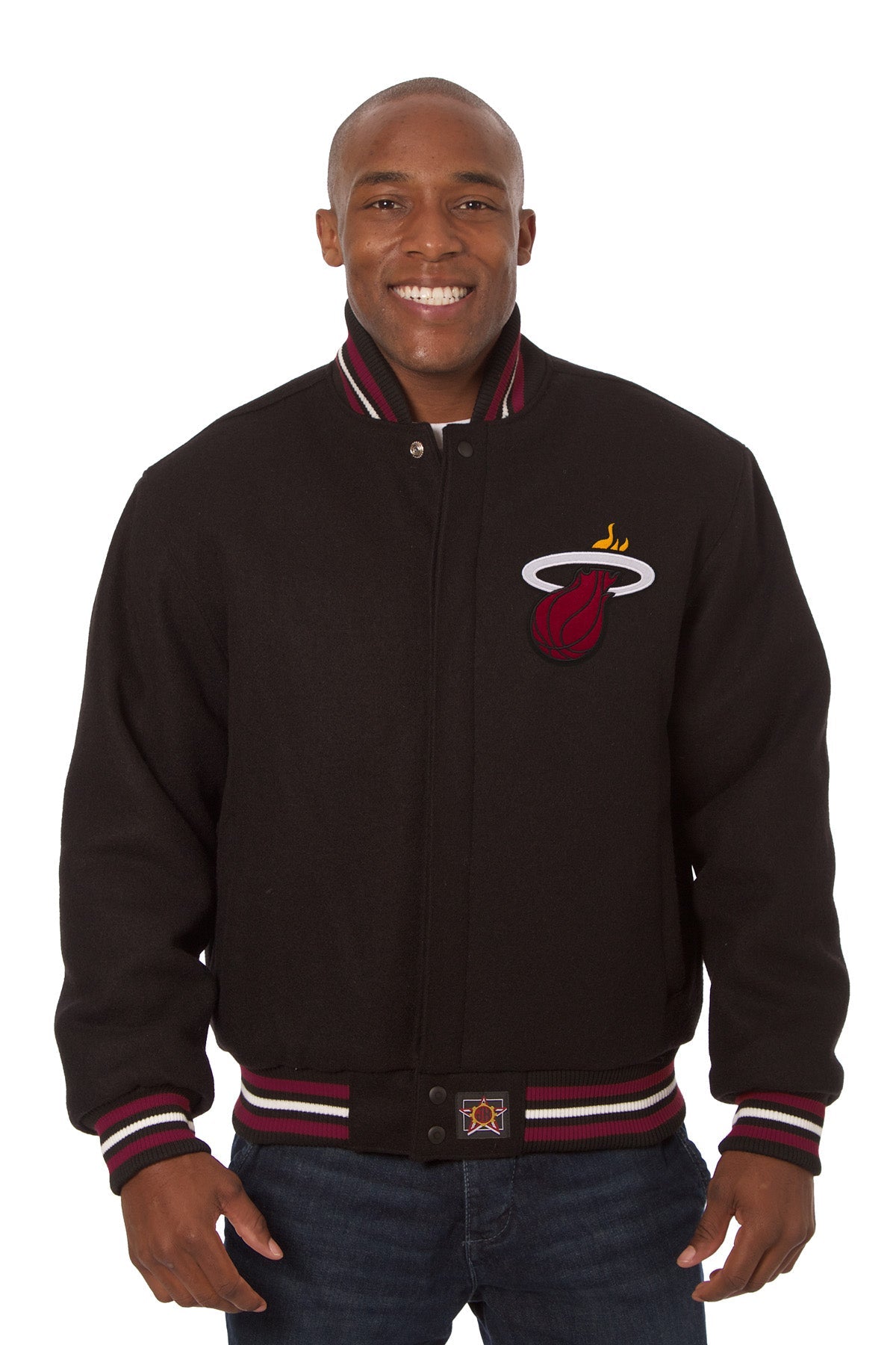Miami Heat embroidered wool varsity jacket in black with black, red and white ribbing.