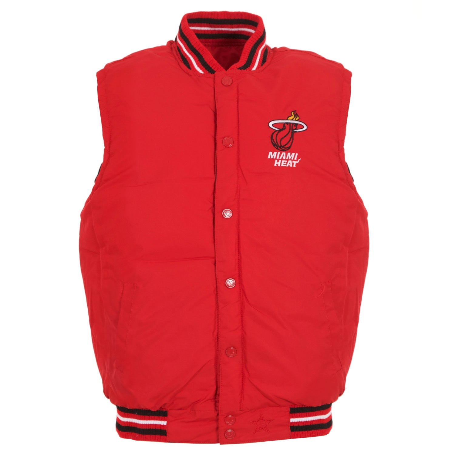 Miami Heat ripstop nylon puffer vest in black-red with embroidered logos.