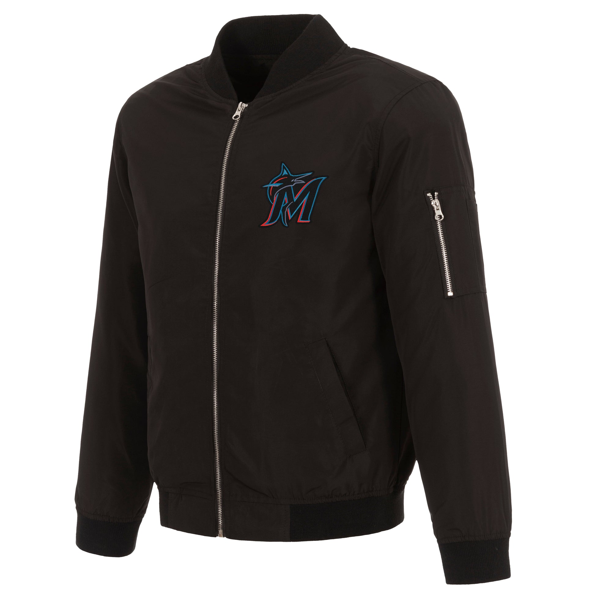 Miami Marlins nylon bomber in black with embroidered logos.
