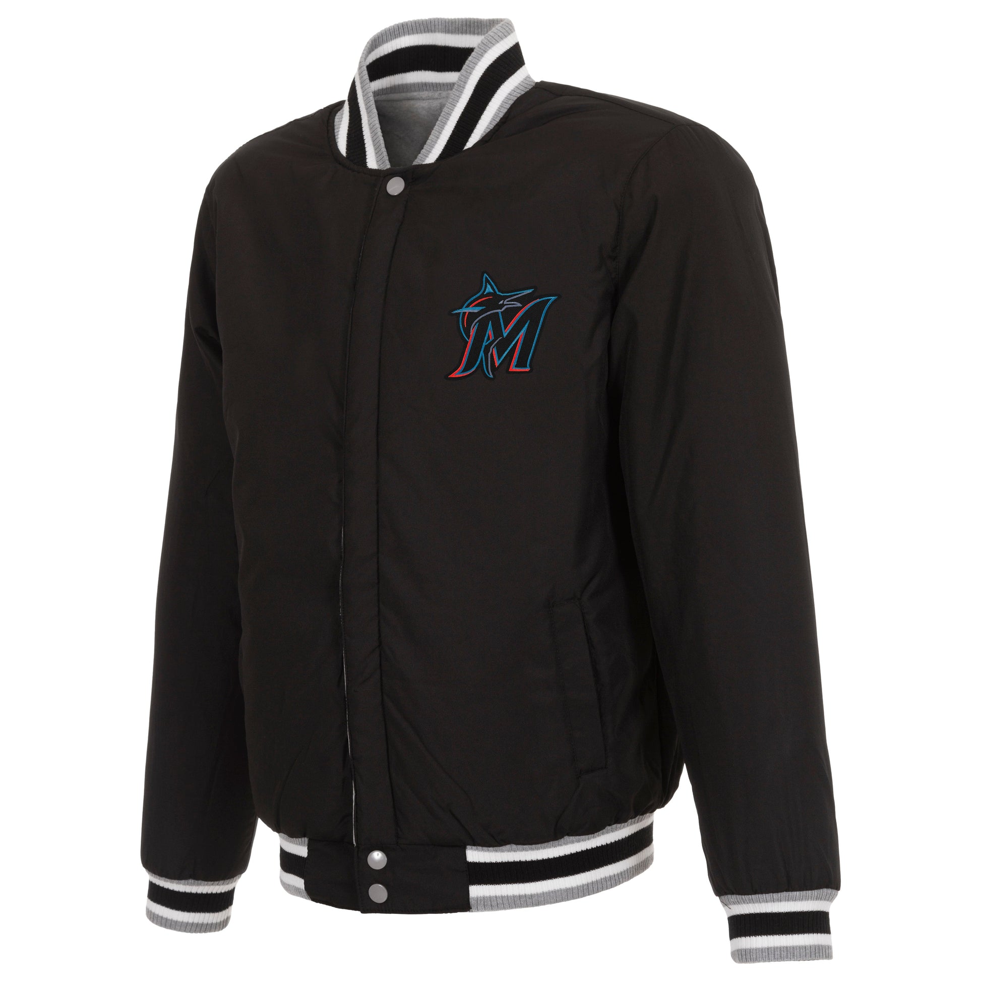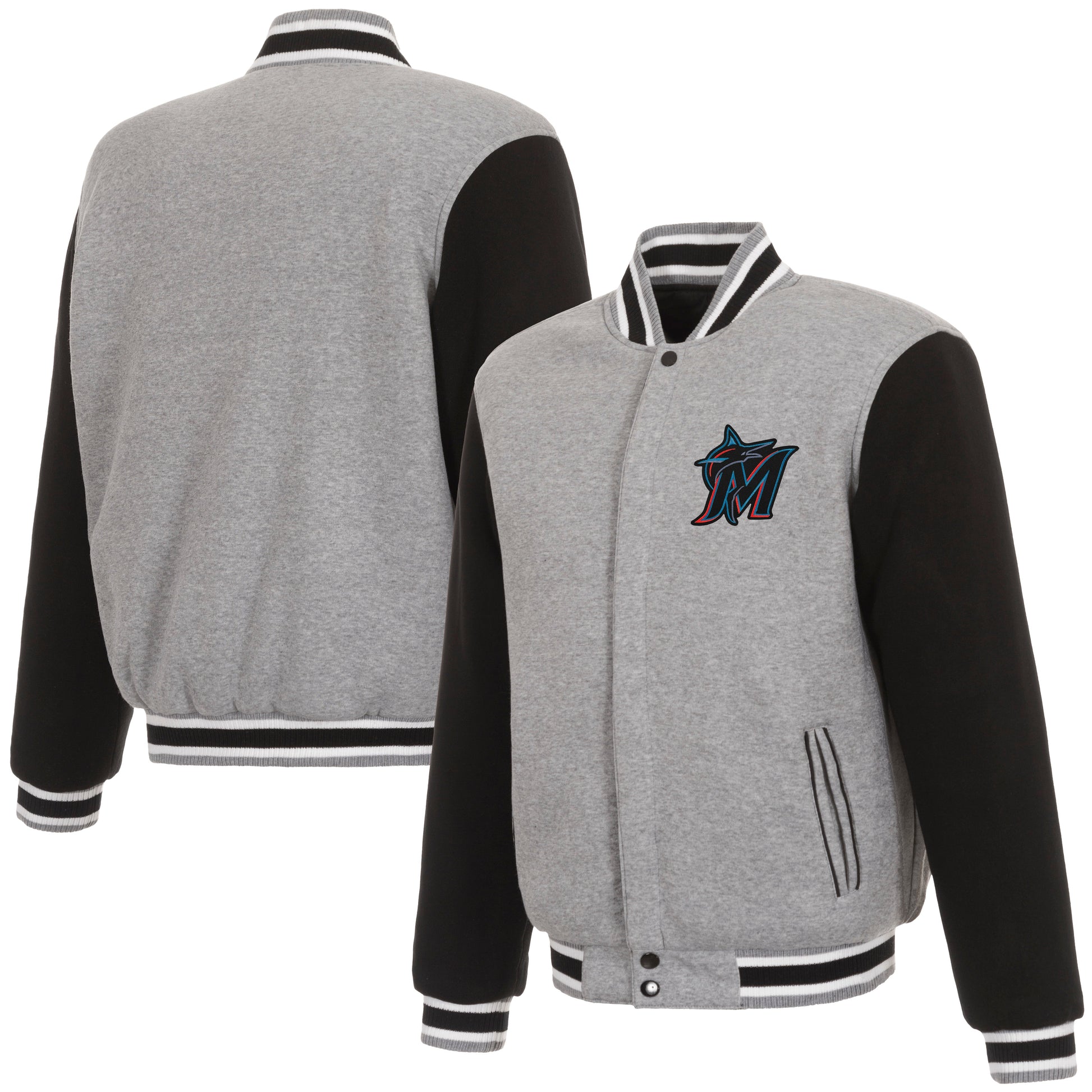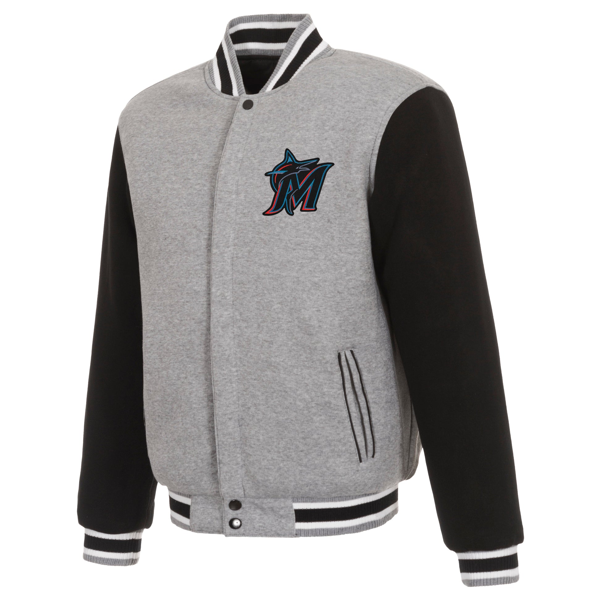 Miami Marlins Reversible Two-Tone fleece jacket in grey and black with embroidered logos. Assembled in the USA. 100% Polyester body, reverse nylon side, snap button closure.