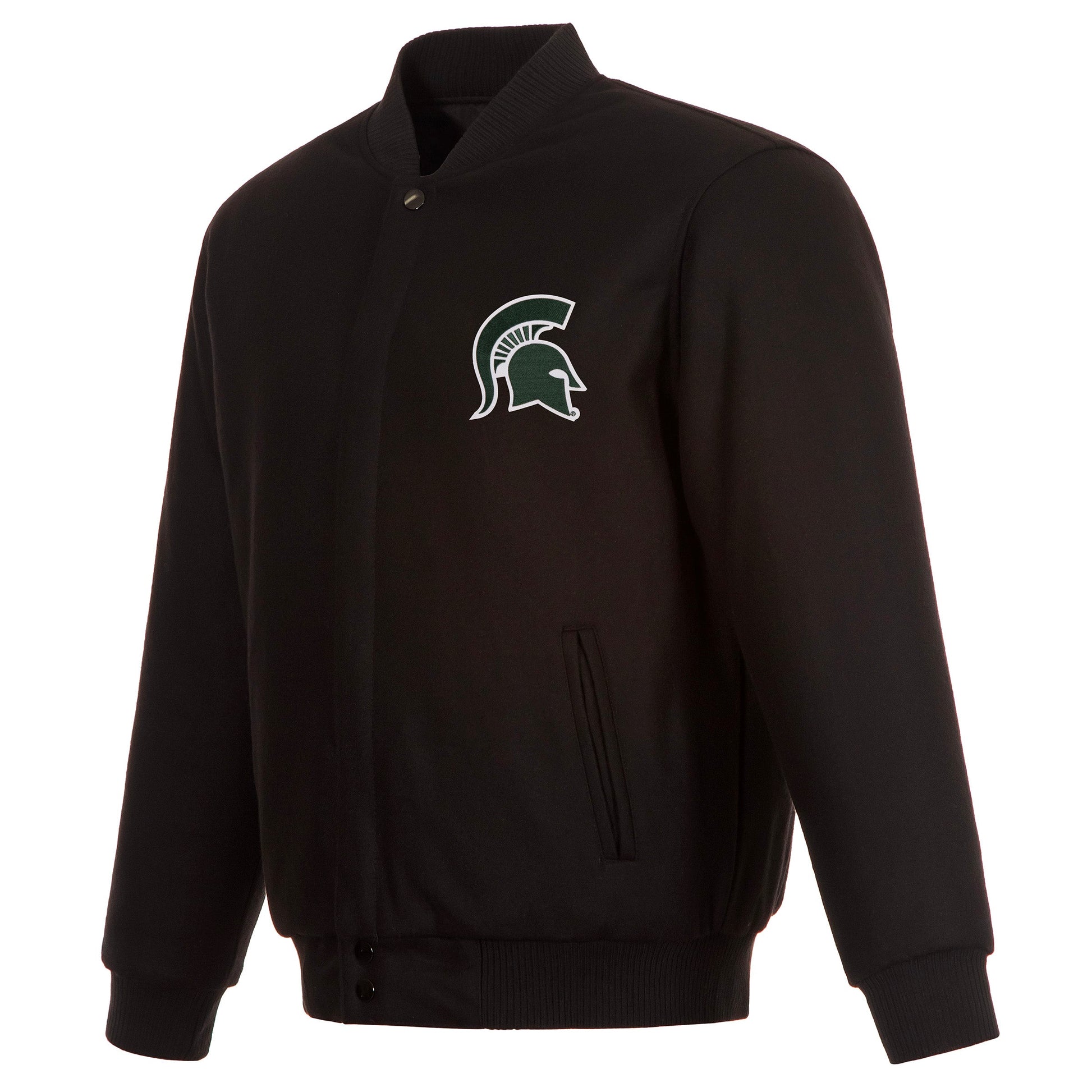 Michigan State University All Wool Jacket with nylon lining in black with embroidered logos. Assembled in the USA. 55% wool 45% polyester body. Snap button closure.