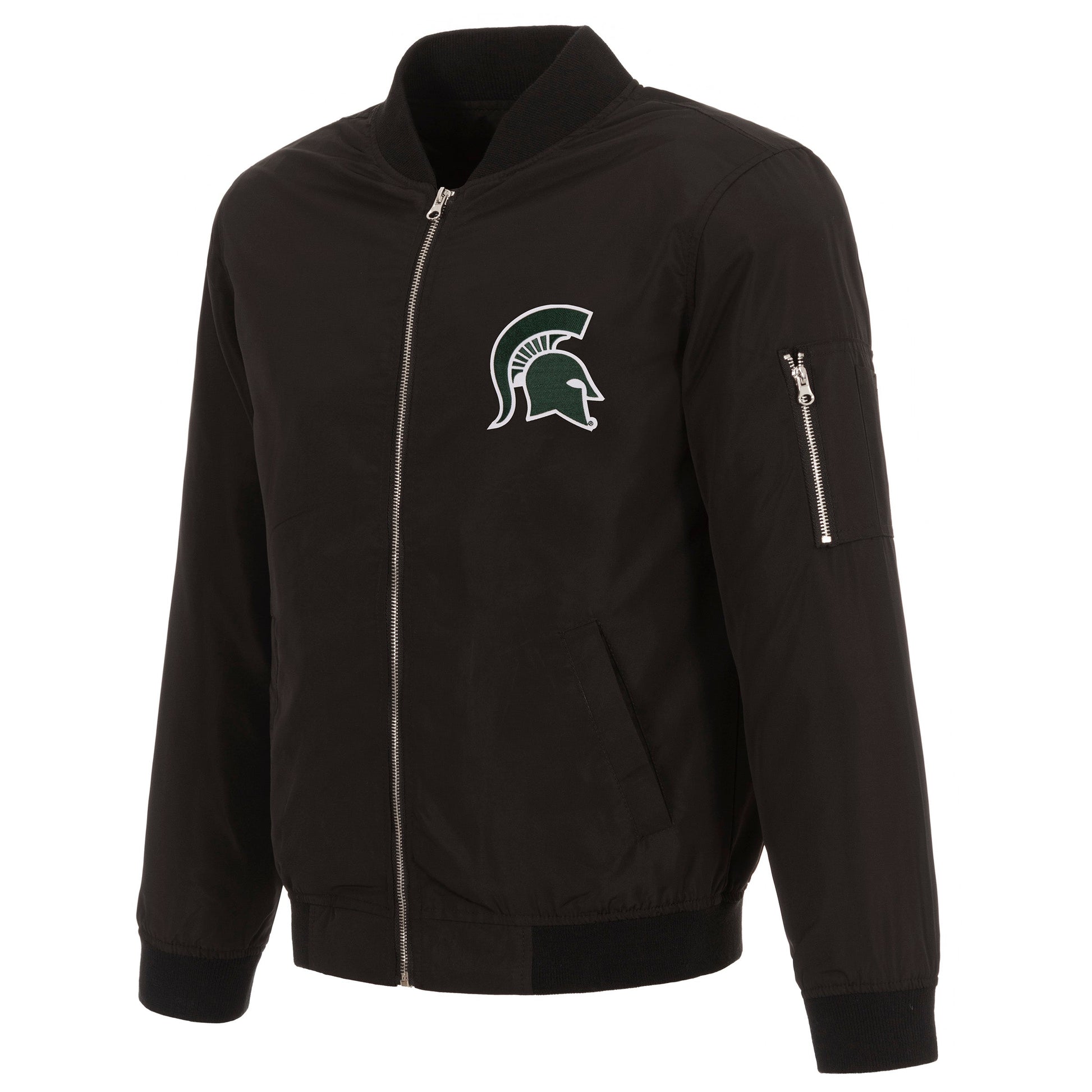 Michigan State University nylon bomber in black with embroidered logos. Assembled in the USA. 100% Nylon, full length zip front.
