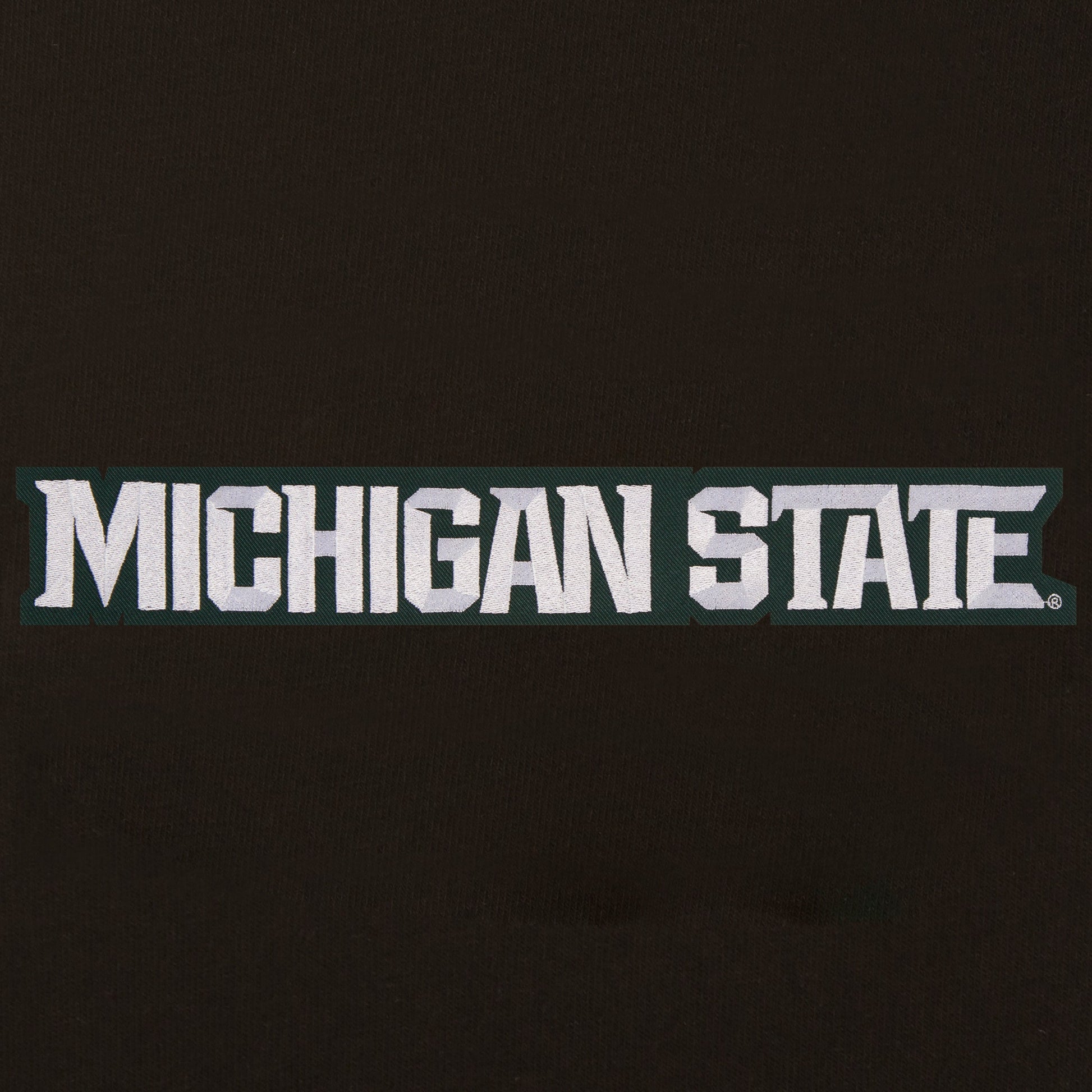Michigan State University reversible fleece jacket with faux leather sleeves in black and white with embroidered logos. Assembled in the USA. 100% polyester body, faux leather sleeves, snap button closure.