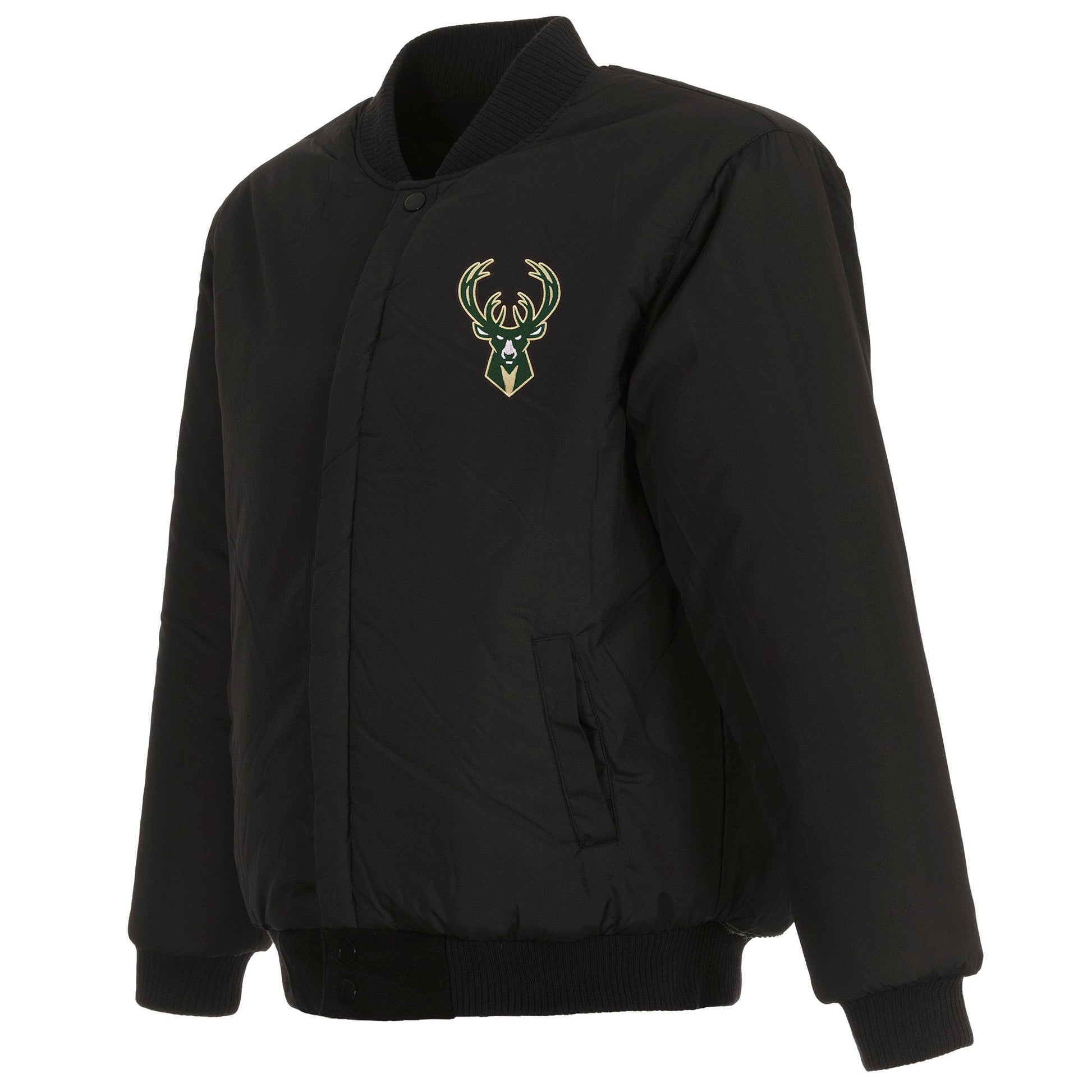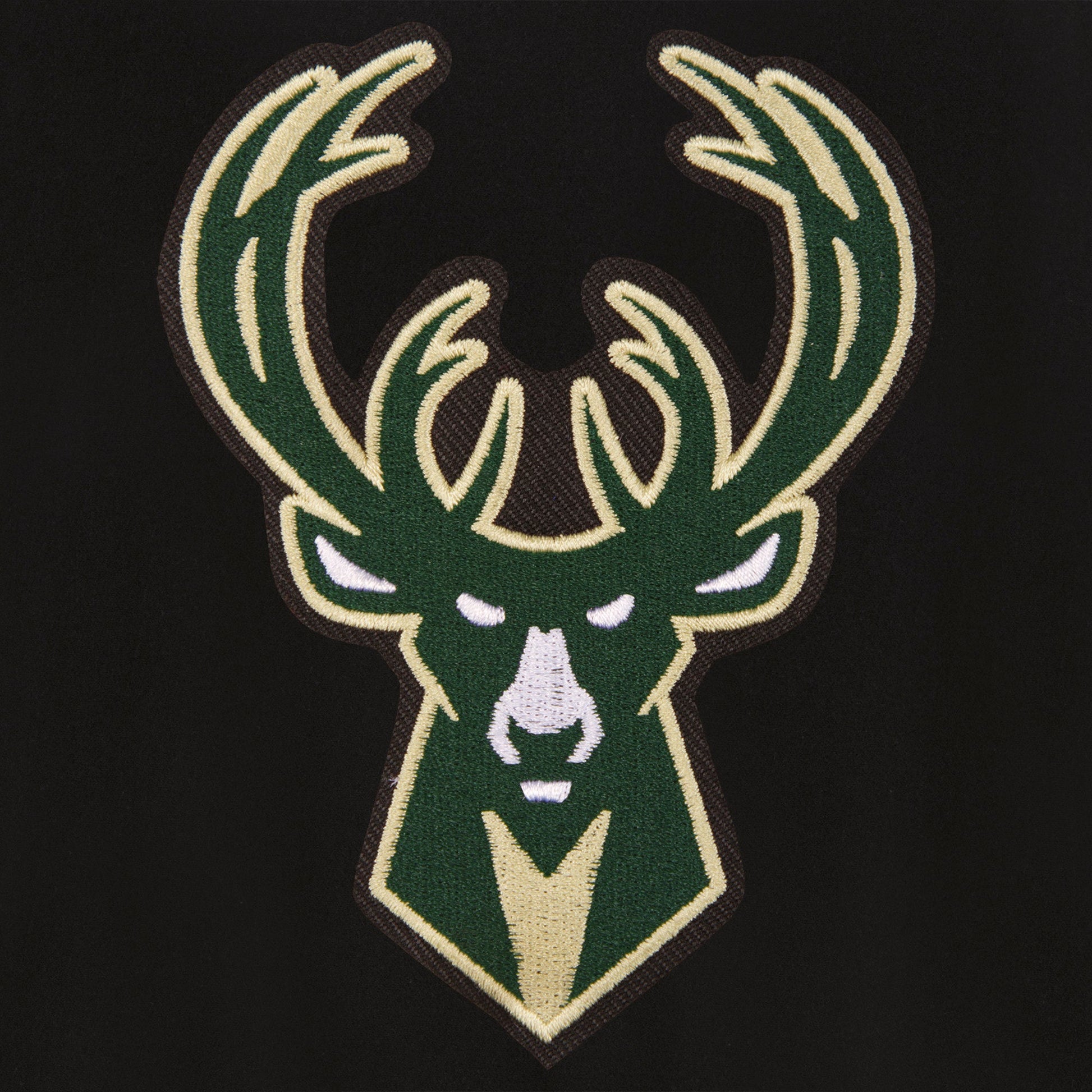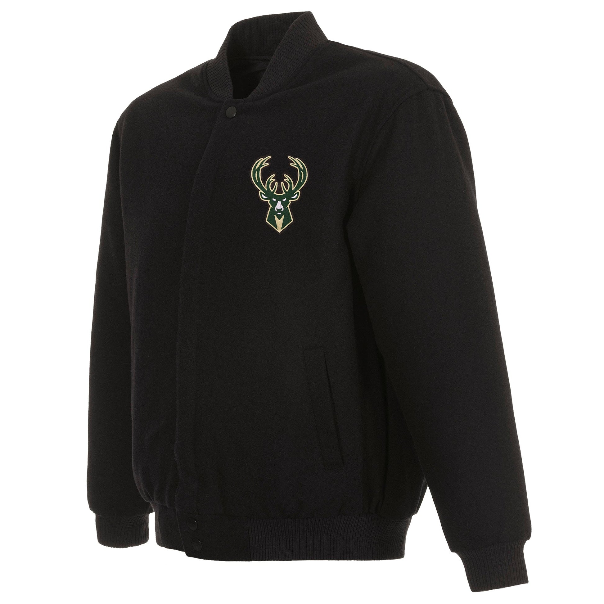 Milwaukee Bucks All Wool Jacket with nylon lining in black with embroidered logos. Assembled in the USA. 55% wool 45% polyester body. Snap button closure.
