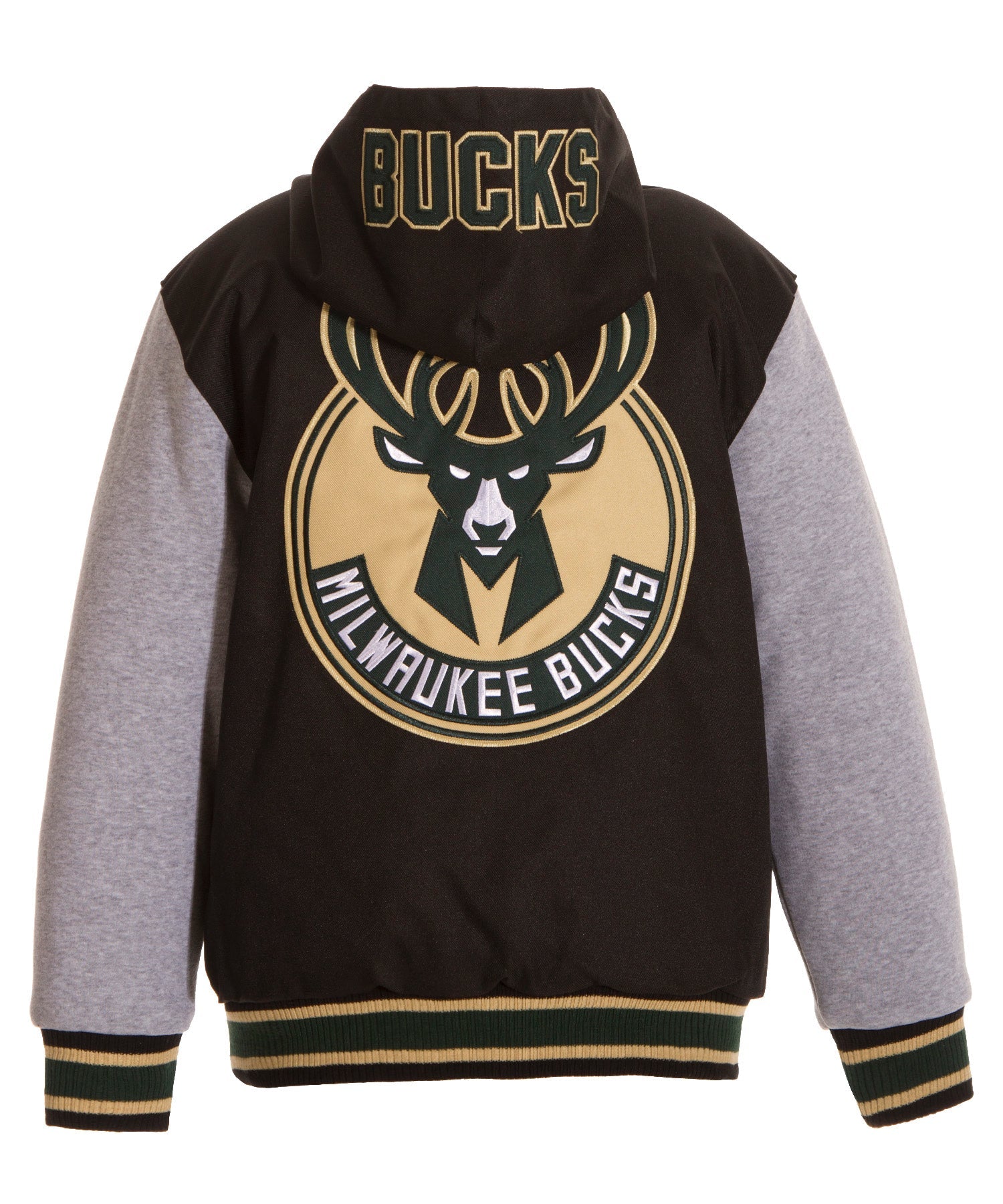 Milwaukee Bucks kid's reversible poly-twill hooded jacket in navy-gray with fleece sleeves and embroidered appliqué logos. Reverse side is nylon.