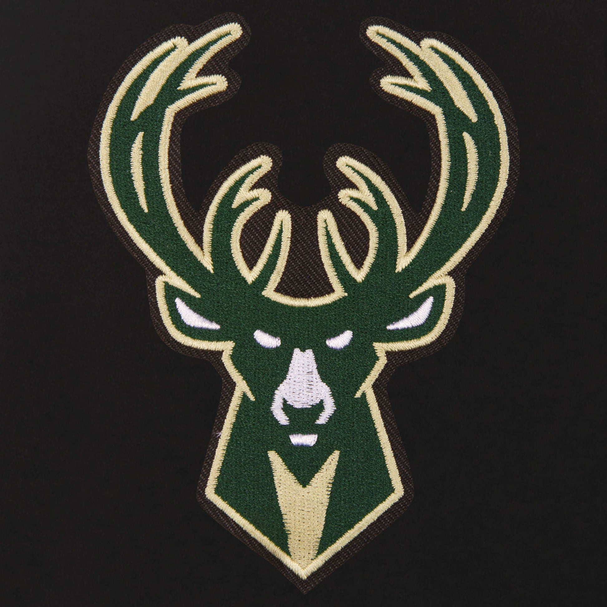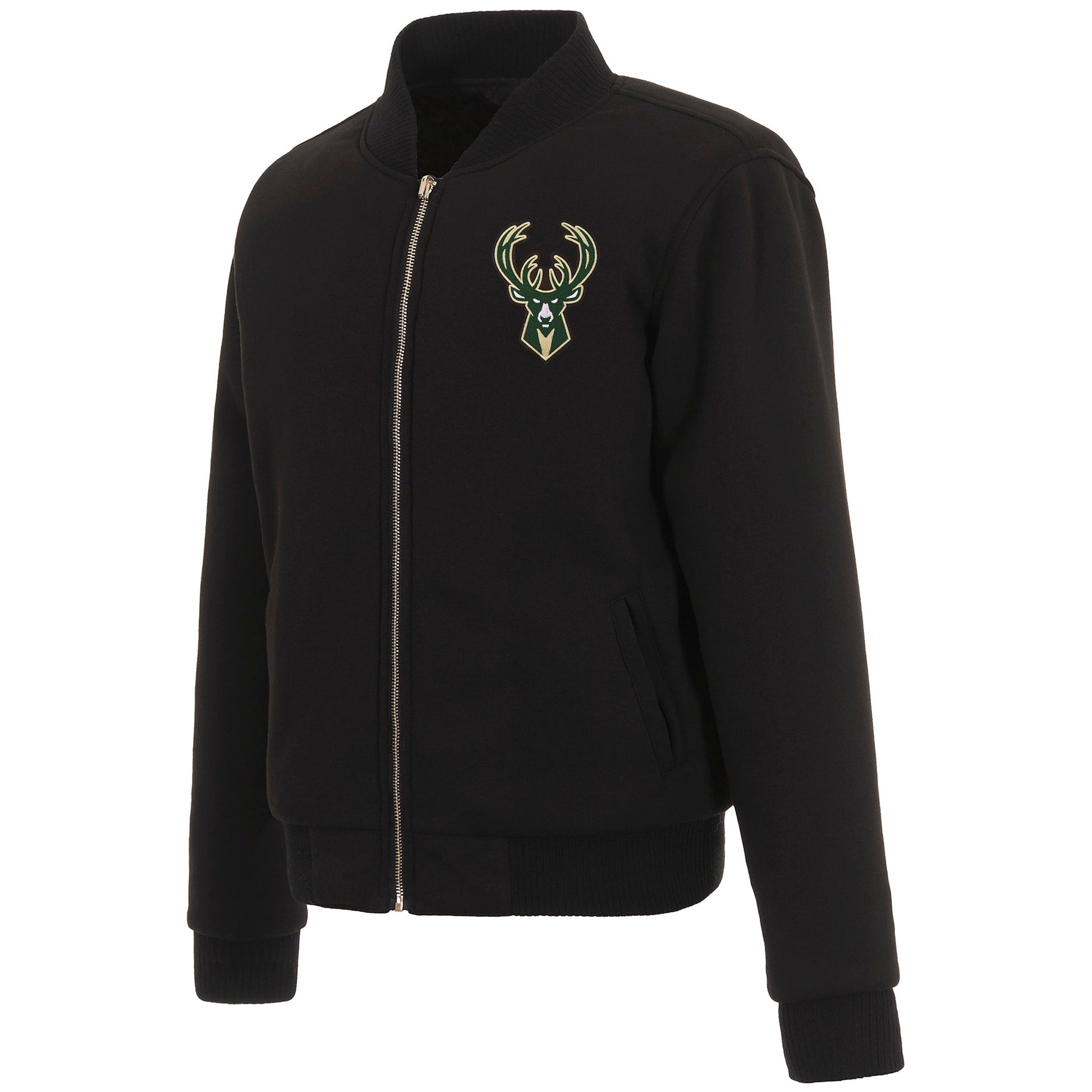 Milwaukee Bucks Ladies Reversible Fleece Jacket in black with embroidered logos. Assembled in the USA. 100% polyester body, reverse nylon side, metal zip closure.