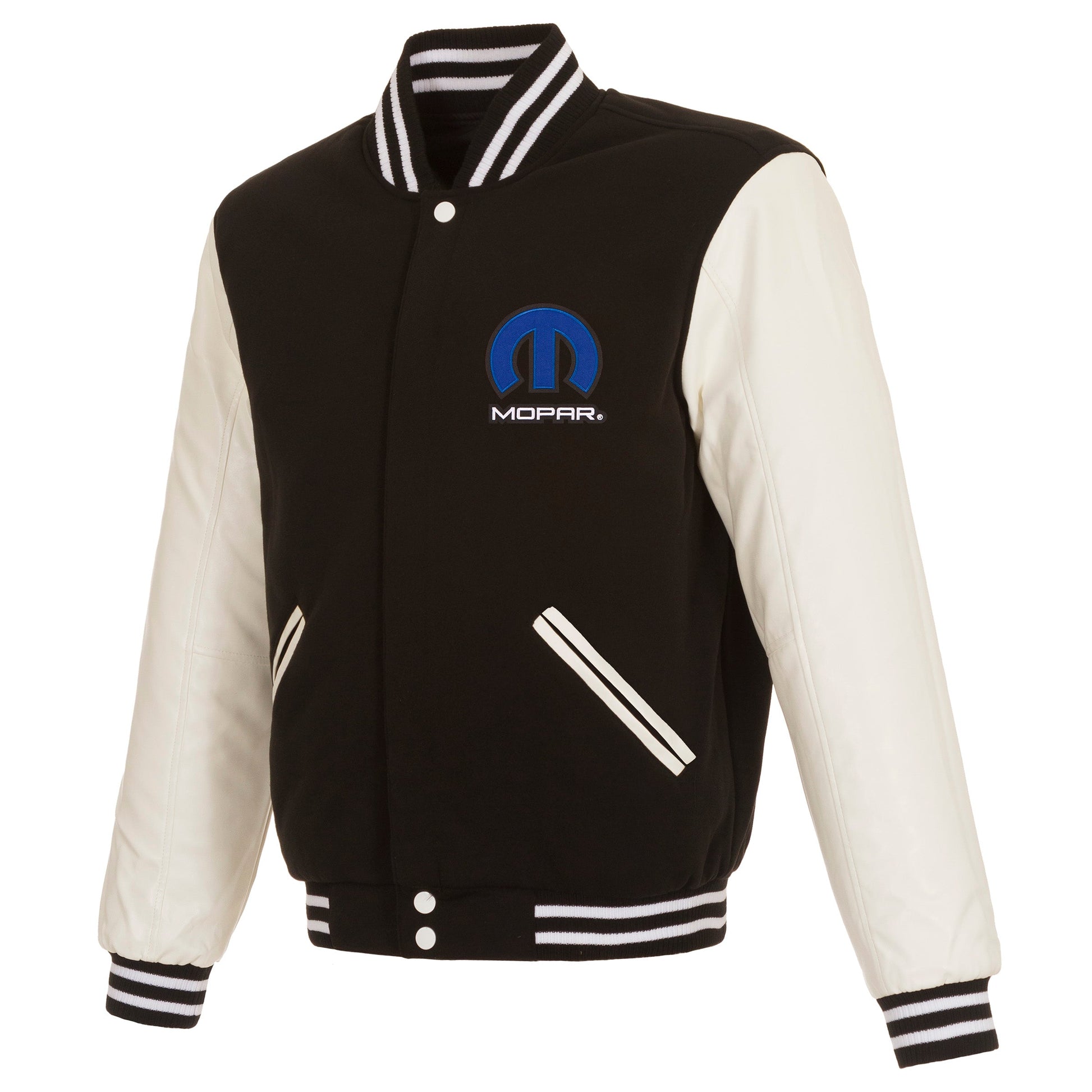 Mopar reversible fleece jacket with Faux Leather sleeves in black-white with nylon lining and embroidered logos. (Front and Back Logos)