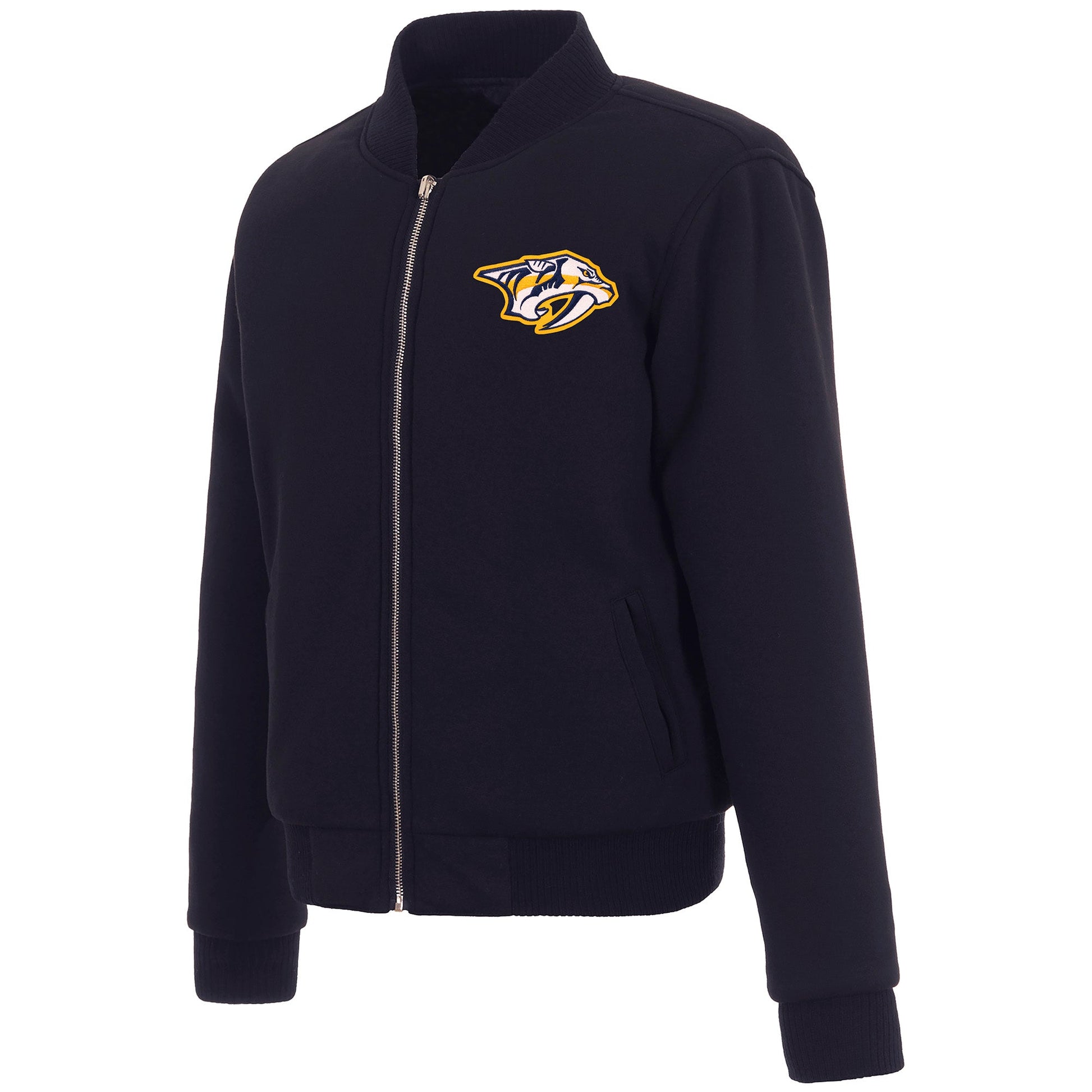 Nashville Predators Ladies reversible fleece jacket in navy with embroidered logos. Assembled in the USA. 100% polyester body, reverse nylon side, metal zip closure.