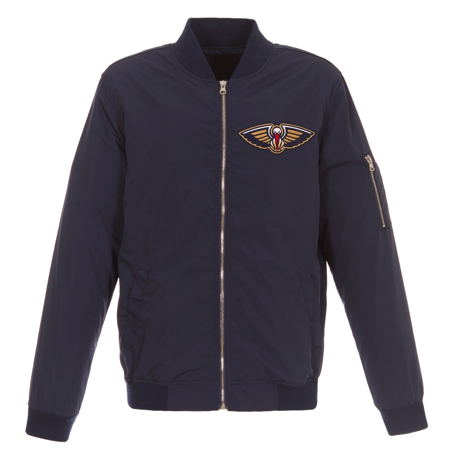 New Orleans Pelicans nylon bomber in navy with embroidered logos.