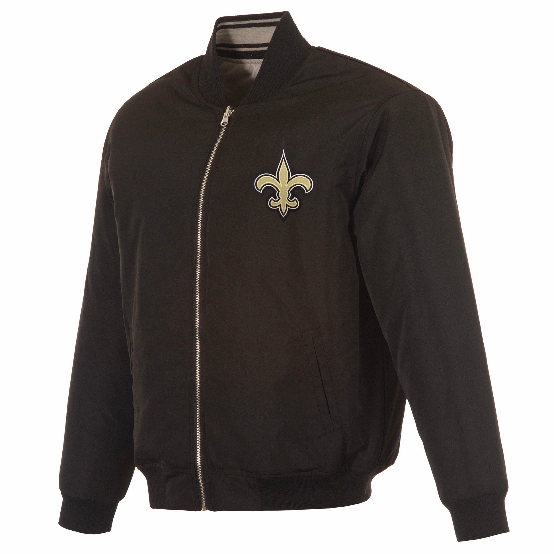 New Orleans Saints reversible nylon bomber in black and grey with embroidered logos. Assembled in the USA. 100% Nylon, full length zip front.