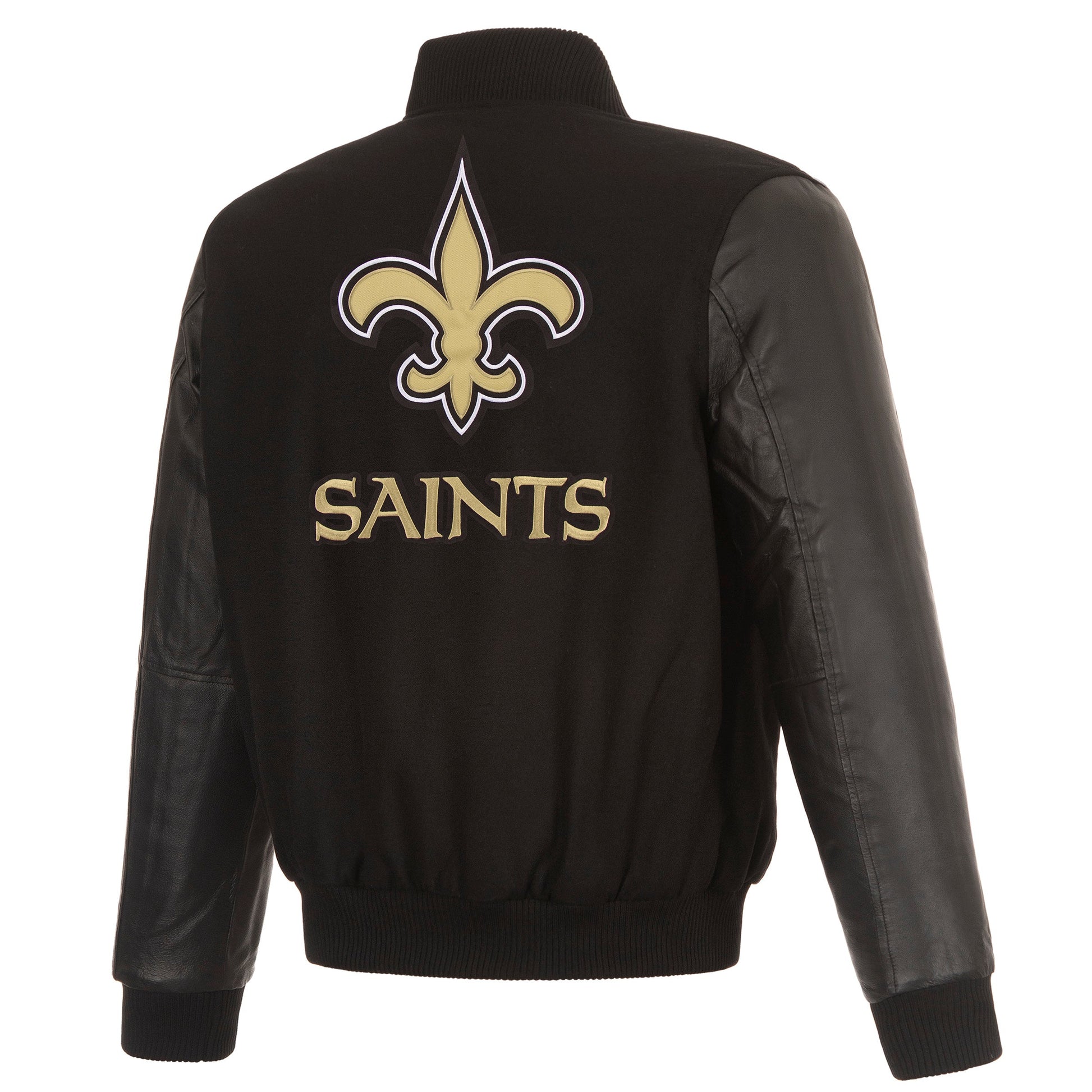 New Orleans Saints reversible wool body and leather sleeves jacket in black with quilted lining and embroidered appliqué logos.