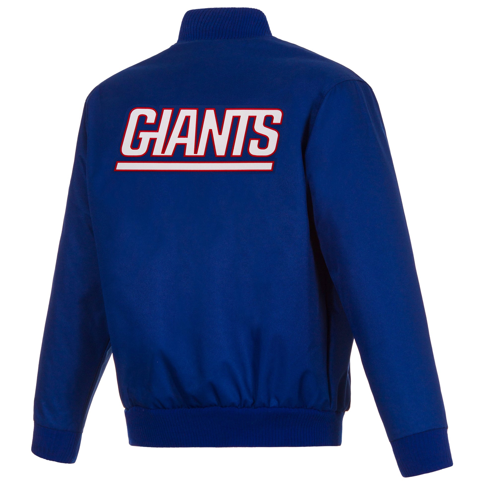 New York Giants poly-twill jacket in royal with quilted nylon lining and embroidered appliqué logos.