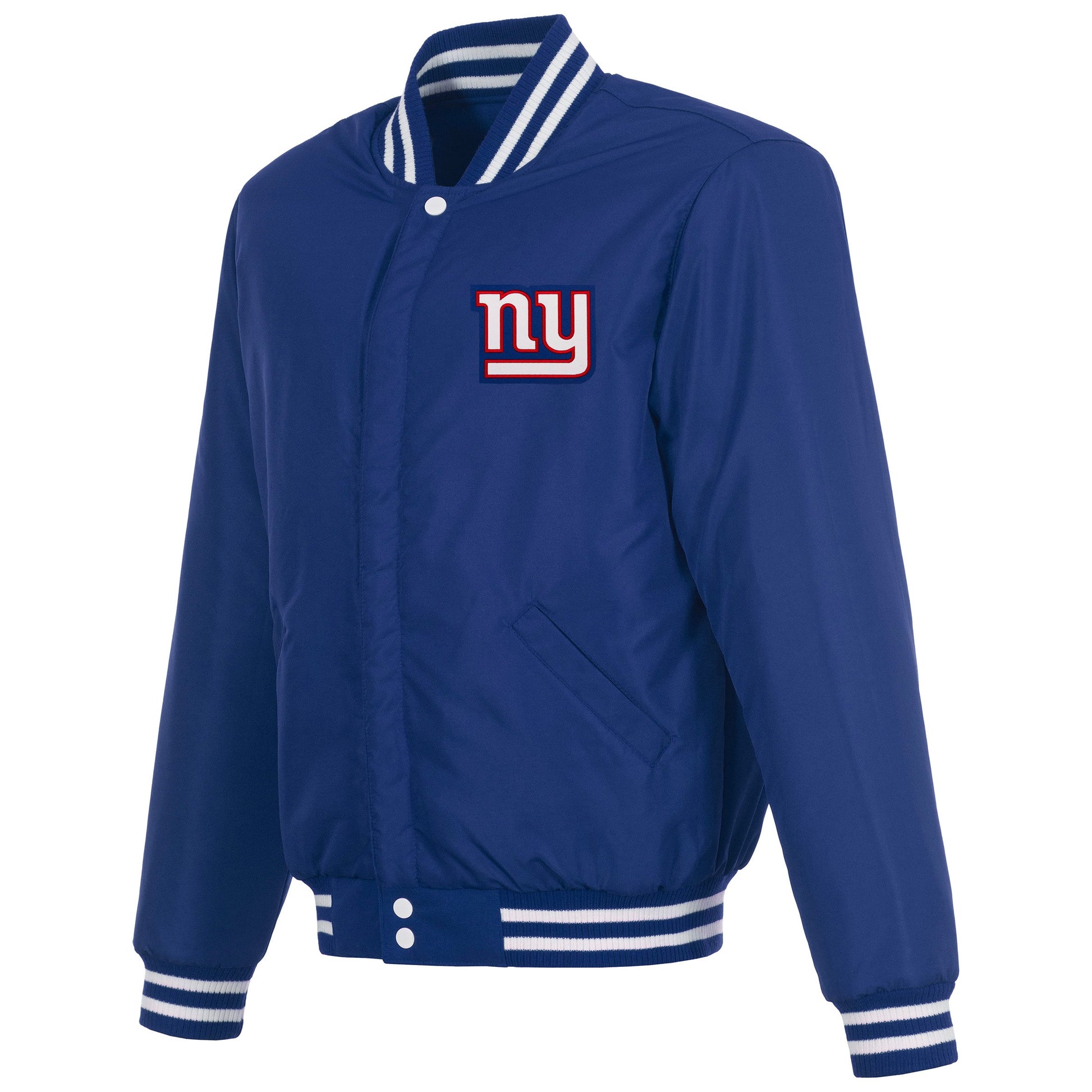 New York Giants reversible fleece jacket with faux leather sleeves in royal and white with embroidered logos. Assembled in the USA. 100% polyester body, faux leather sleeves, snap button closure.
