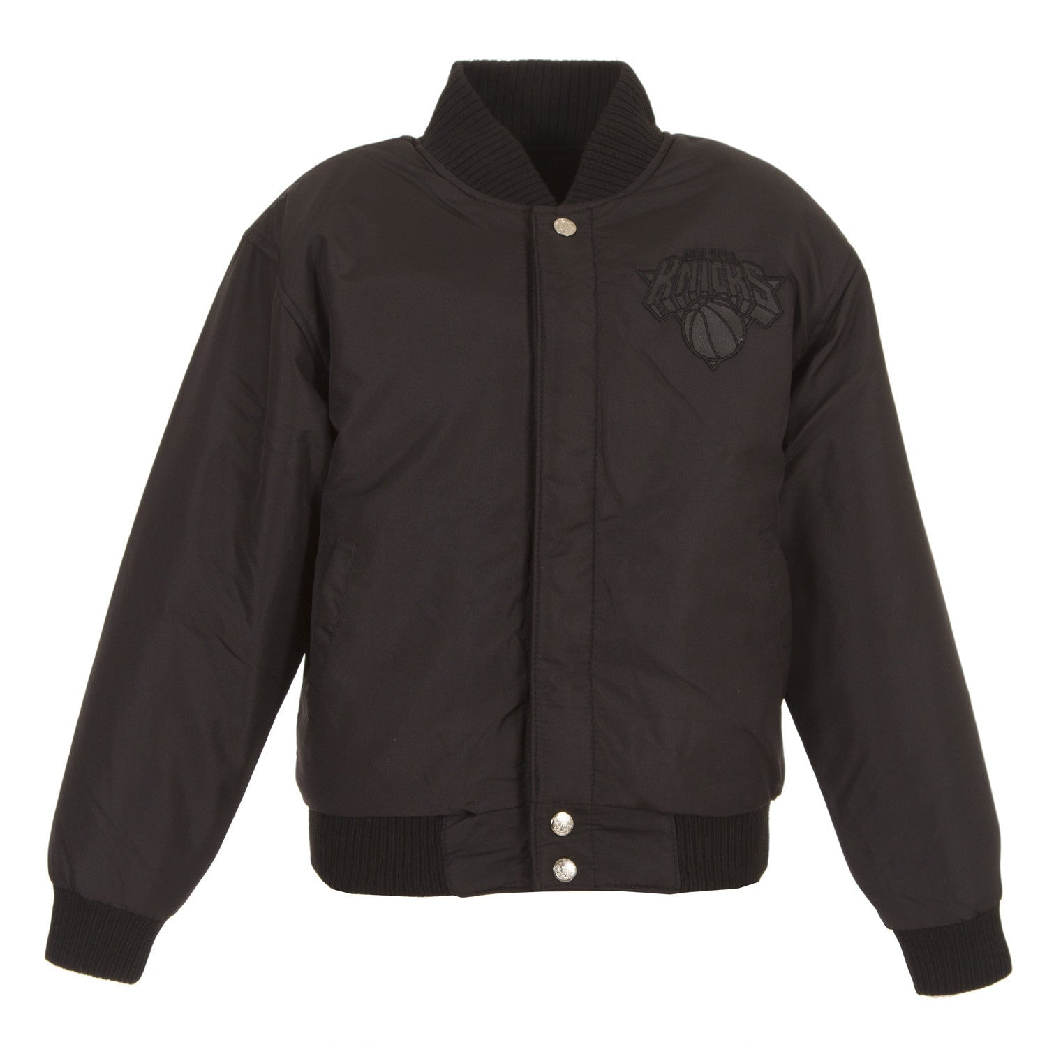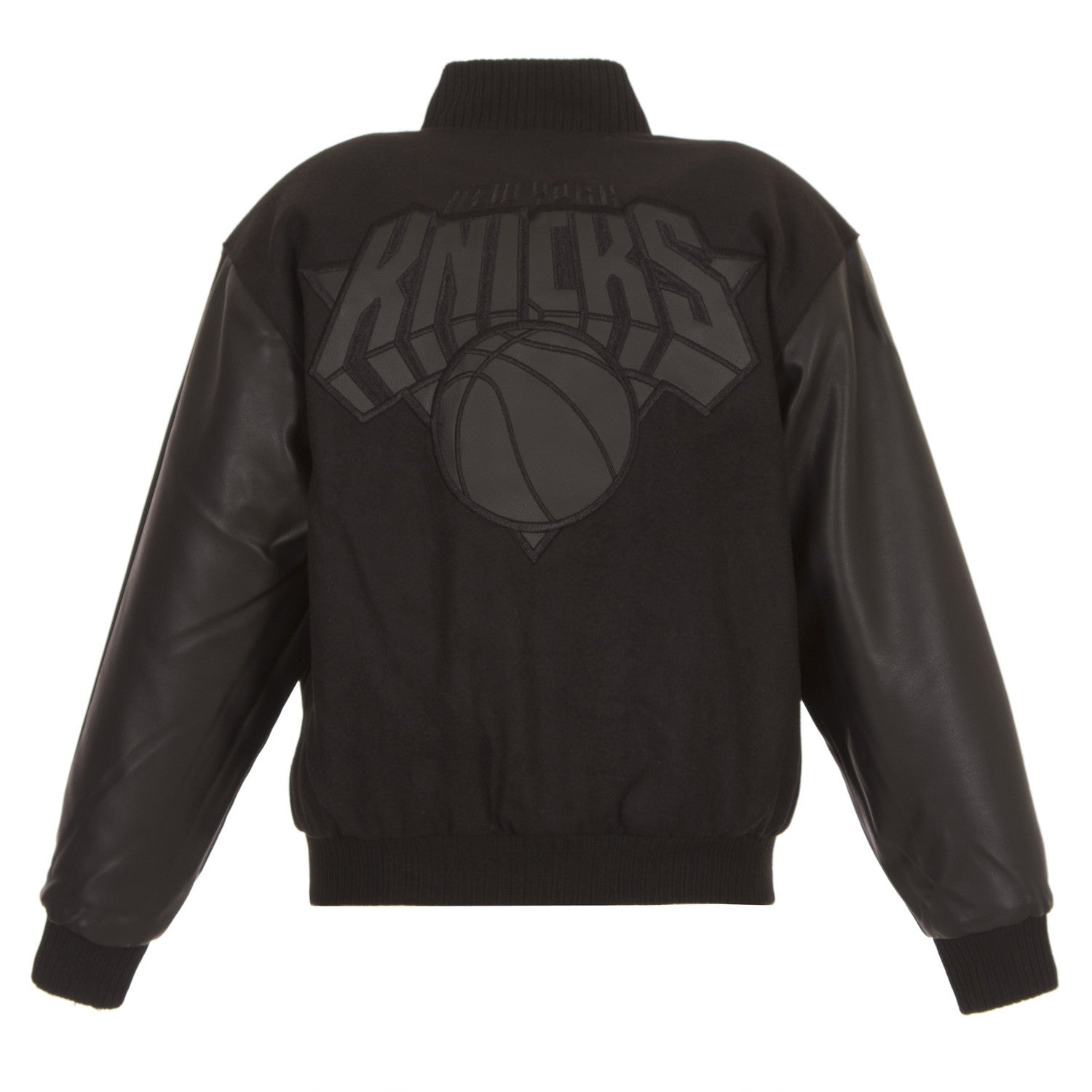 New York Knicks kid's reversible wool jacket with faux leather sleeves in black-black with nylon lining, embroidered logos and knit trim.