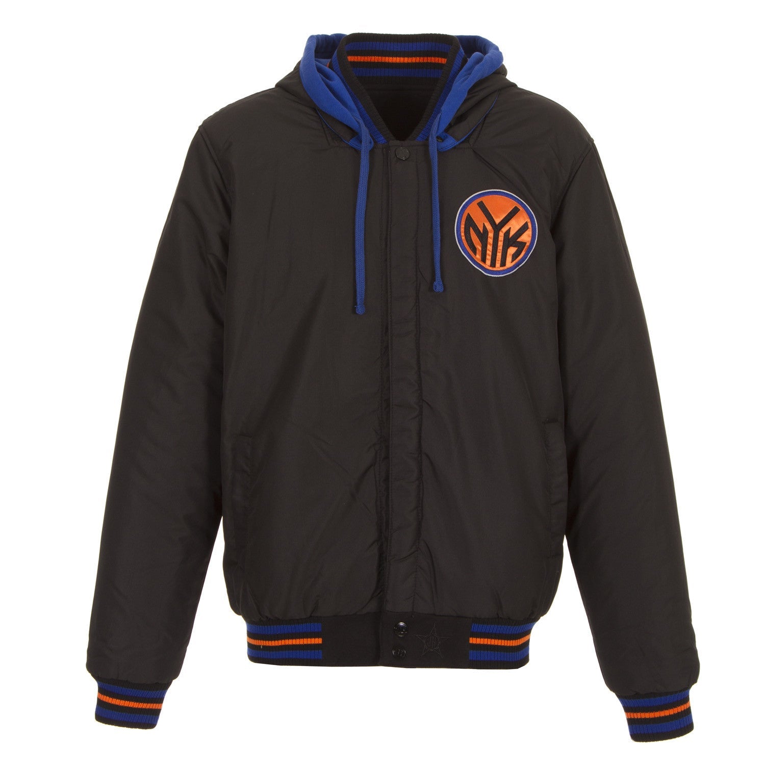 New York Knicks reversible fleece hooded jacket in black-royal with embroidered logos with satin appliqué. Reverse side is nylon.