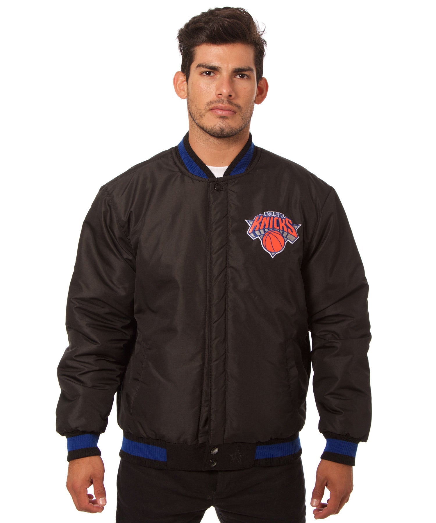 New York Knicks reversible melton jacket in black-gray with PU sleeves and embroidered appliqué logos. Reverse side is nylon.