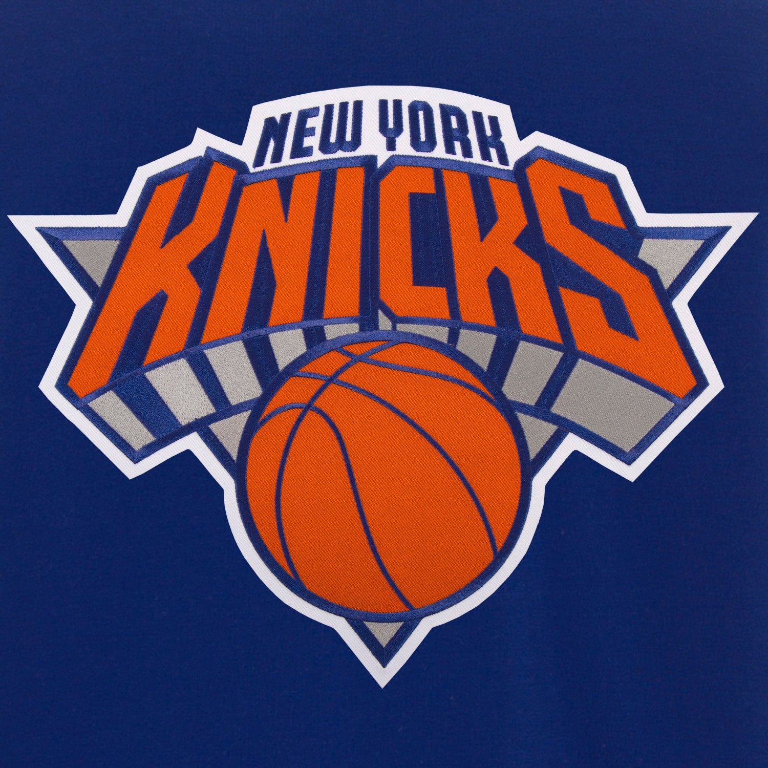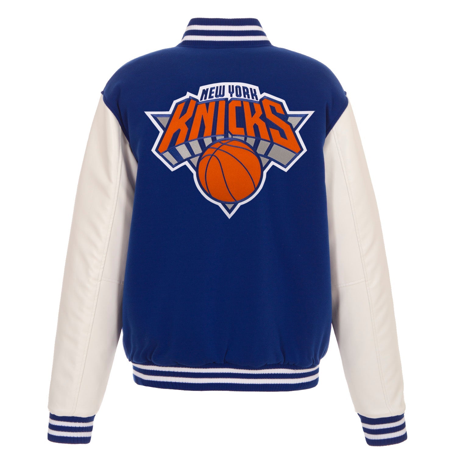 New York Knicks reversible fleece jacket with Faux Leather sleeves in royal-white with nylon lining and embroidered logos. (Front and Back Logos)