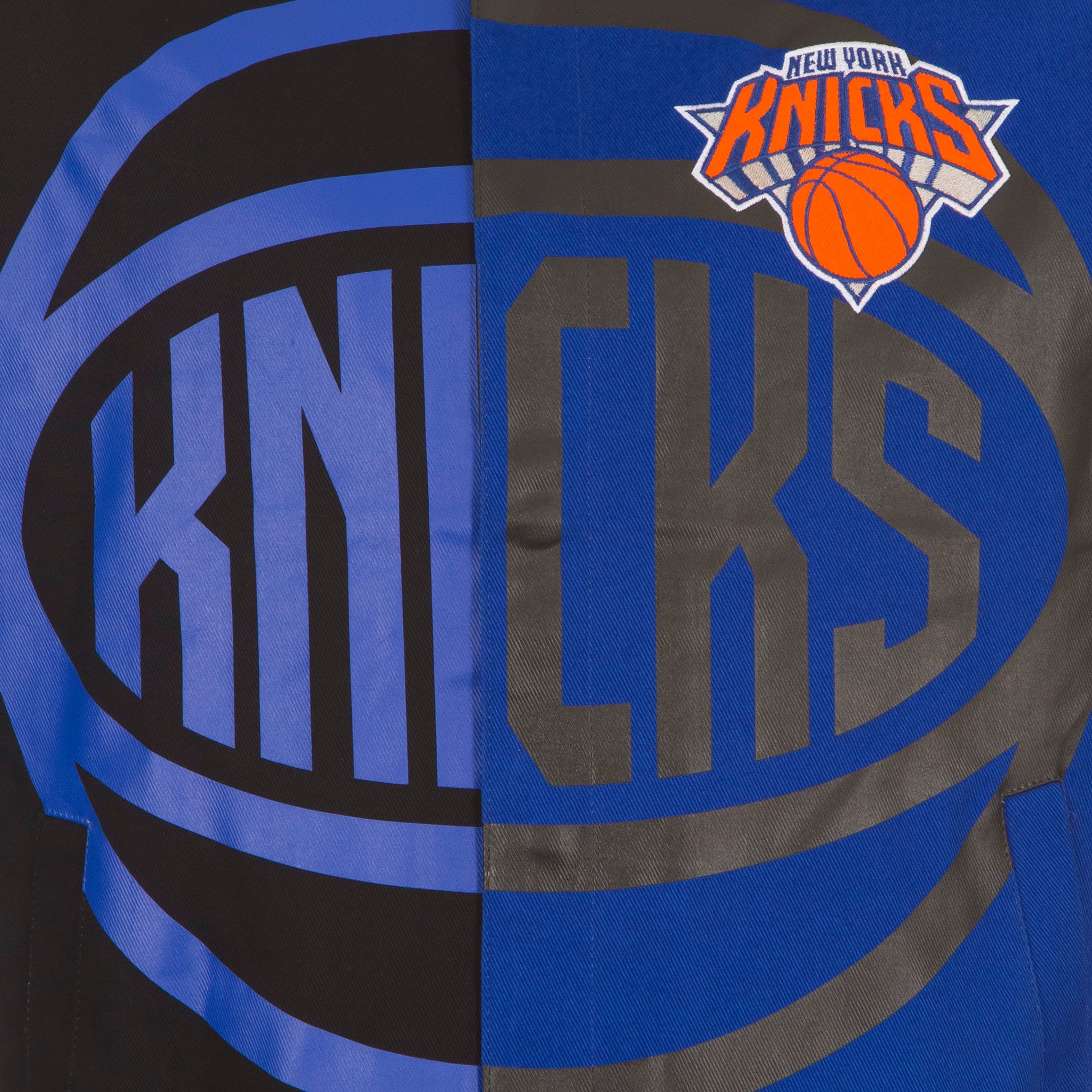 New York Knicks Twill Jacket in black and royal. Made in China. 100% cotton body, traditional snap button closure