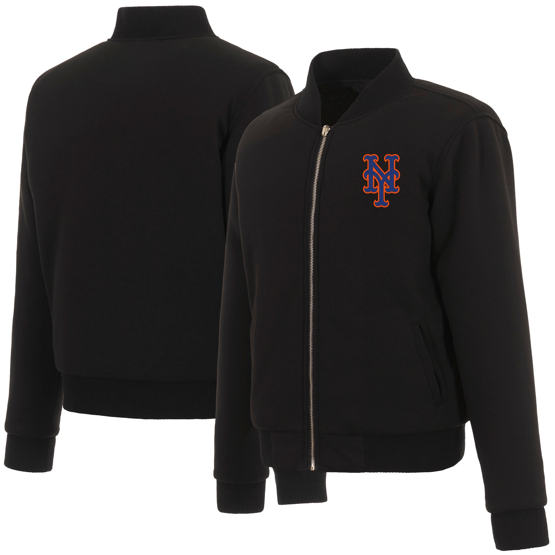 New York Mets Ladies reversible fleece jacket in black with embroidered logos. Assembled in the USA. 100% polyester body, reverse nylon side, metal zip closure.