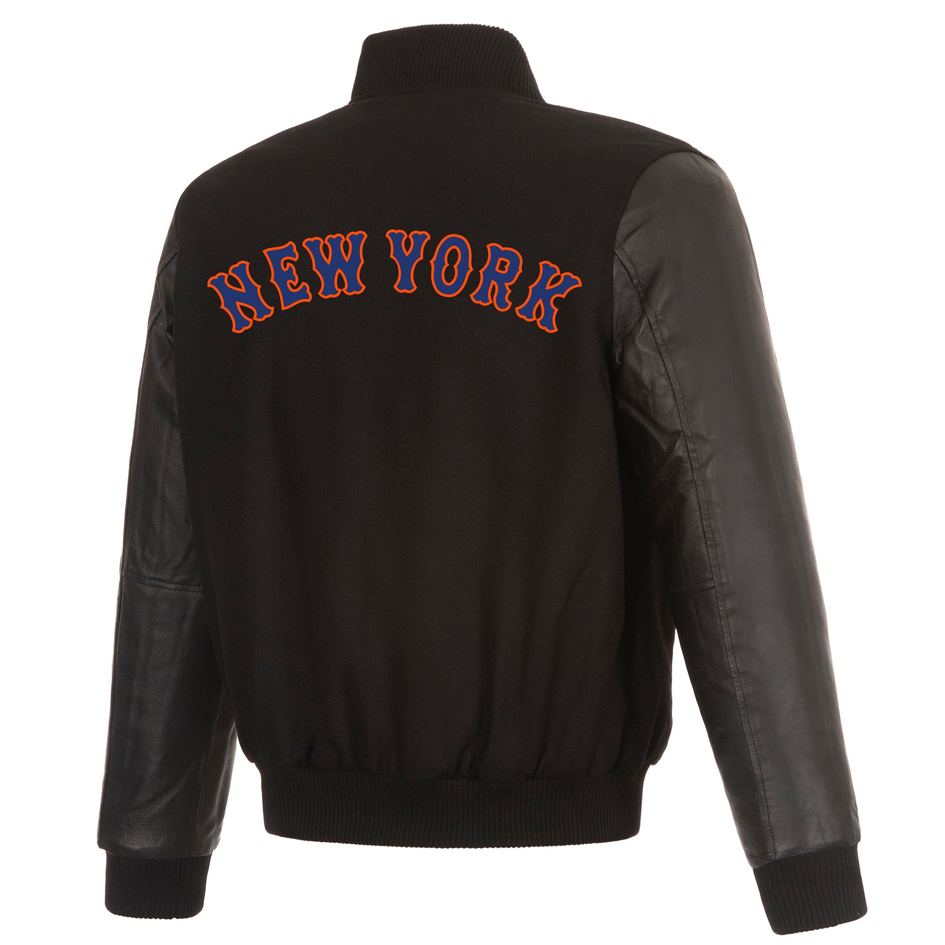New York Mets reversible wool body and leather sleeves jacket in black with nylon lining and embroidered logos.