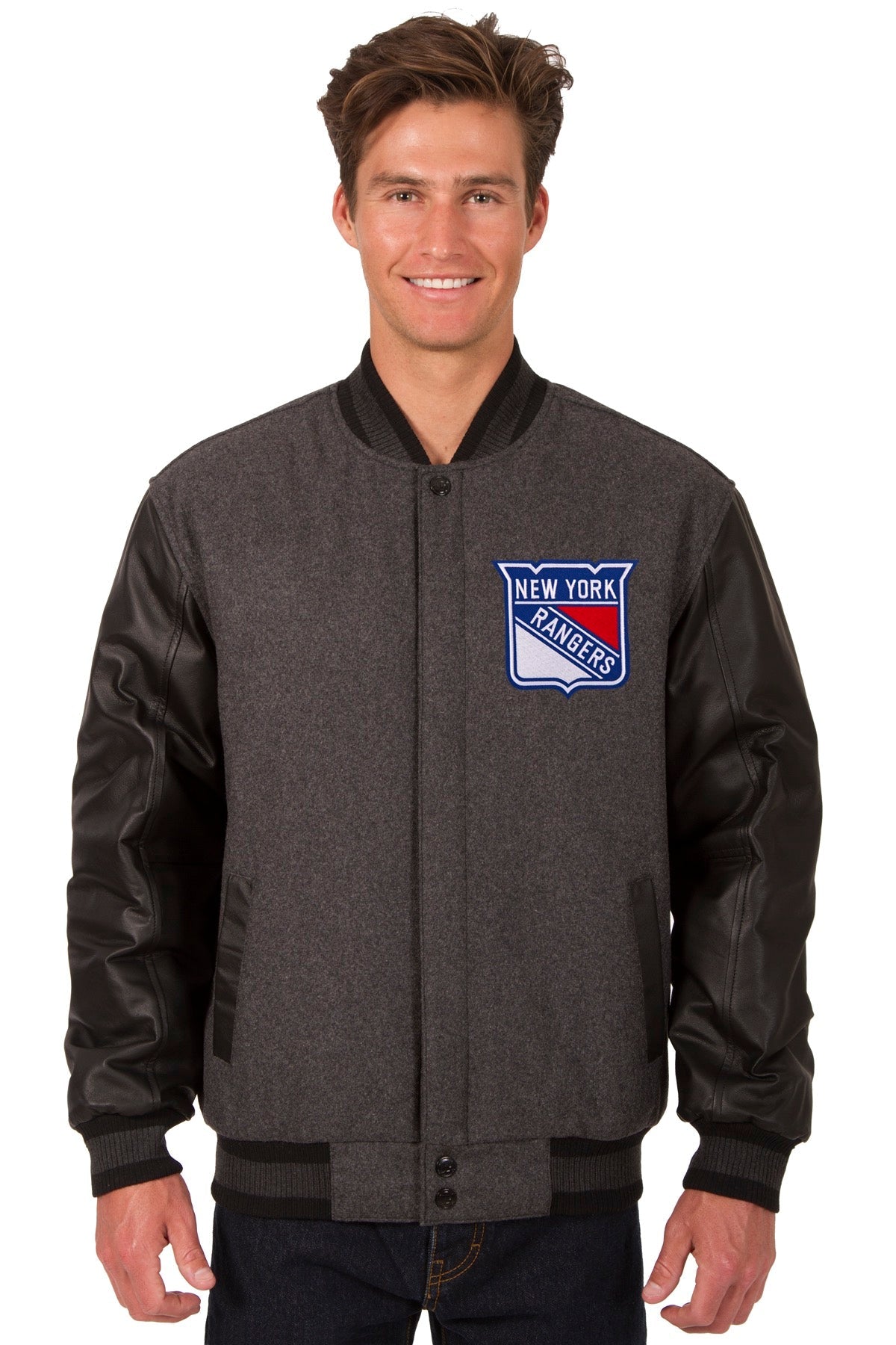 New York Rangers reversible wool and leather jacket in charcoal-black with nylon lining and embroidered appliqué patches. (Front and Back Logos)