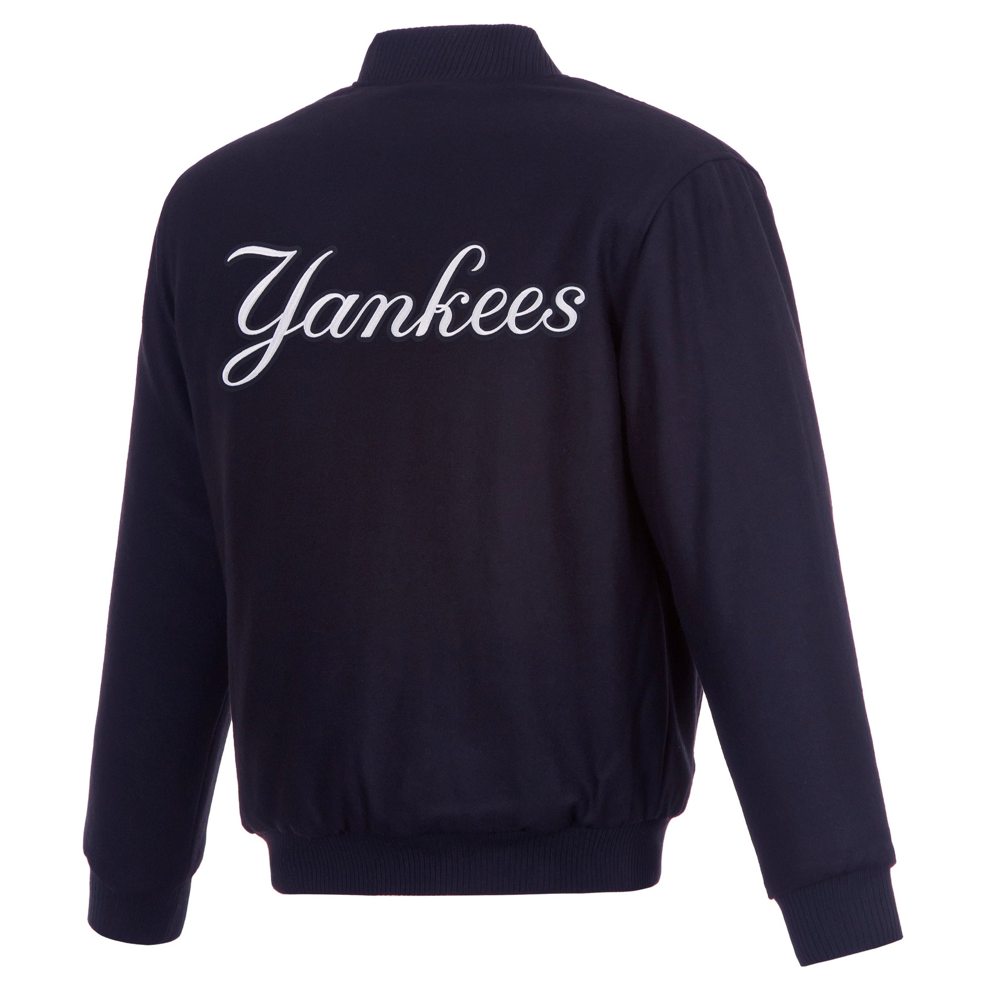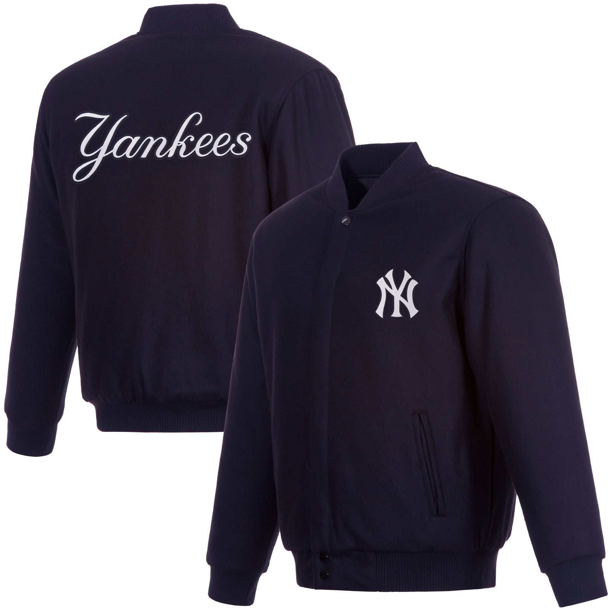 New York Yankees All Wool Jacket with nylon lining in navy with embroidered logos. Assembled in the USA. 55% wool 45% polyester body. Snap button closure.