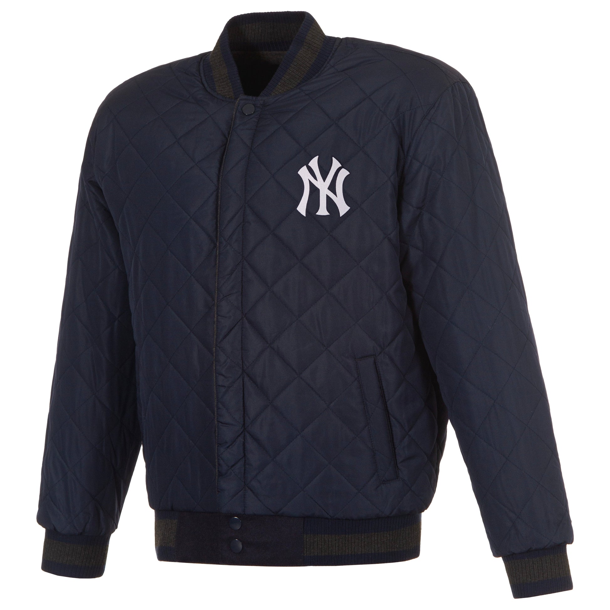 New York Yankees eversible wool and leather jacket in navy and charcoal with nylon lining and embroidered appliqué patches.