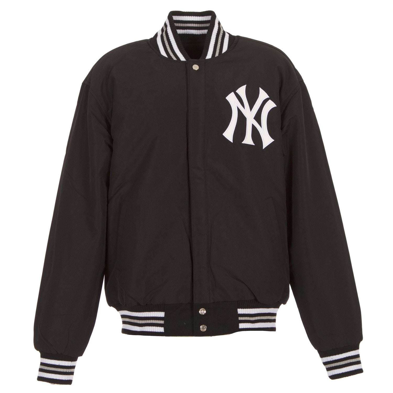 New York Yankees reversible wool jacket in black with nylon lining, embroidered logos and knit trim.