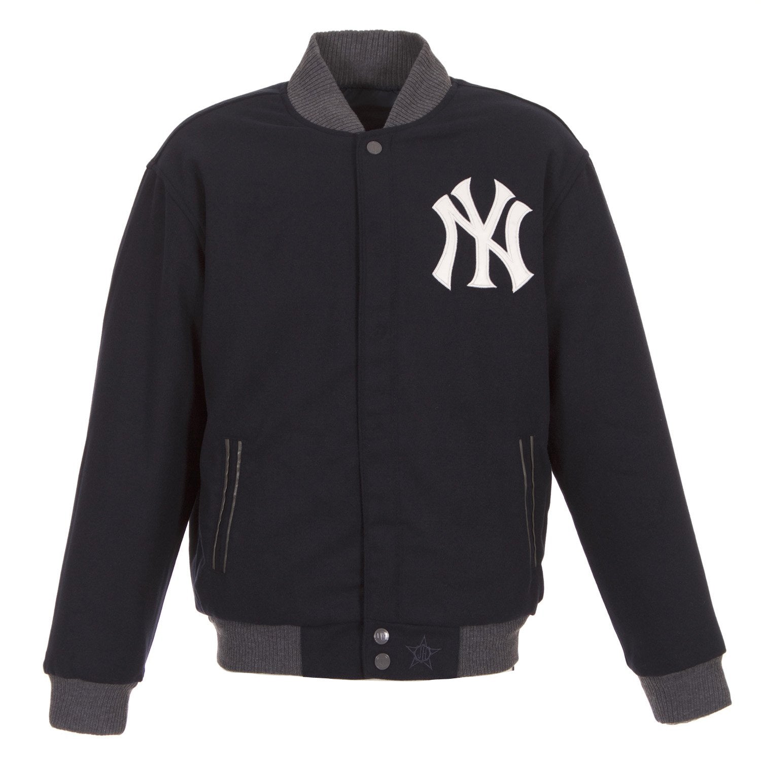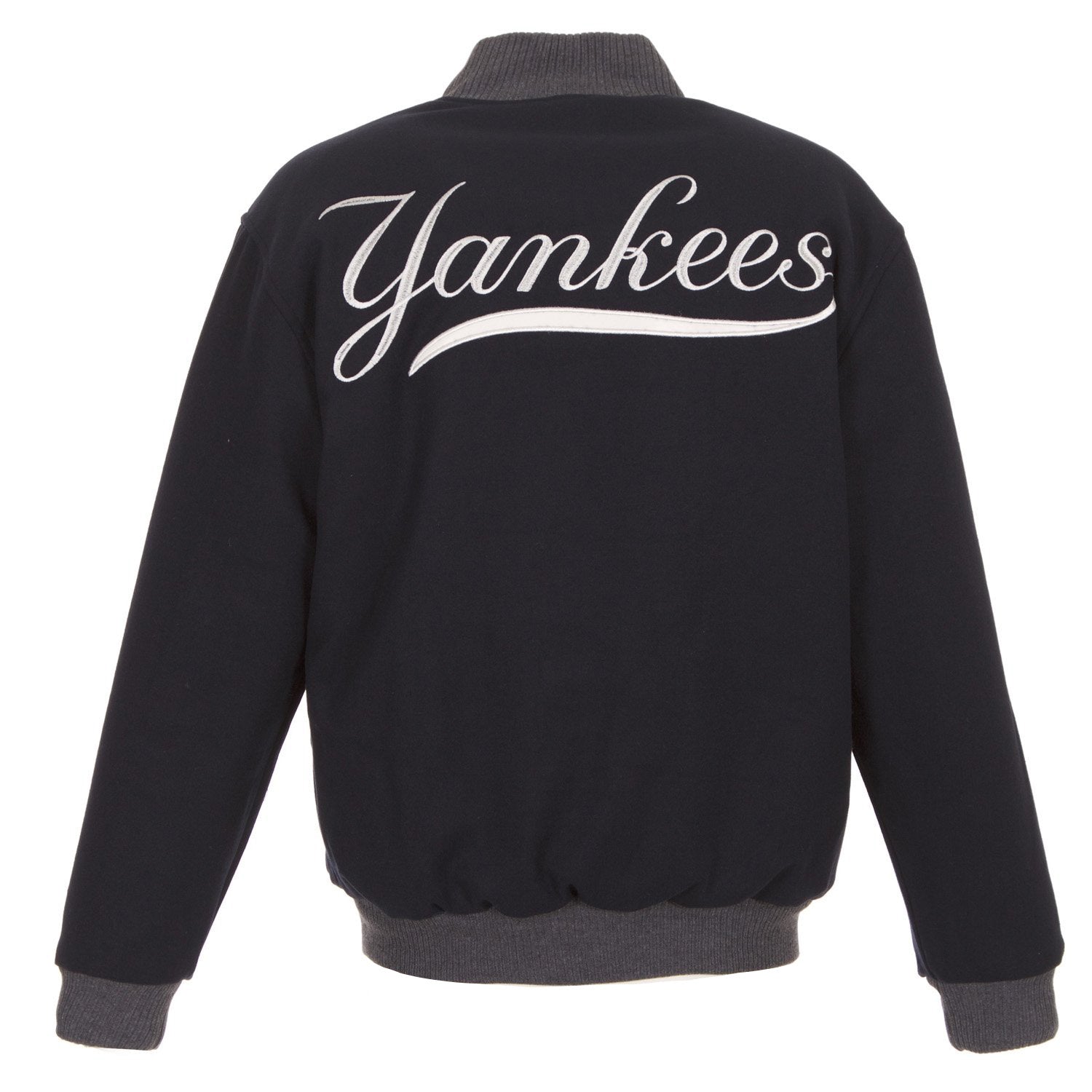 New York Yankees reversible wool jacket in navy with embroidered logos.
