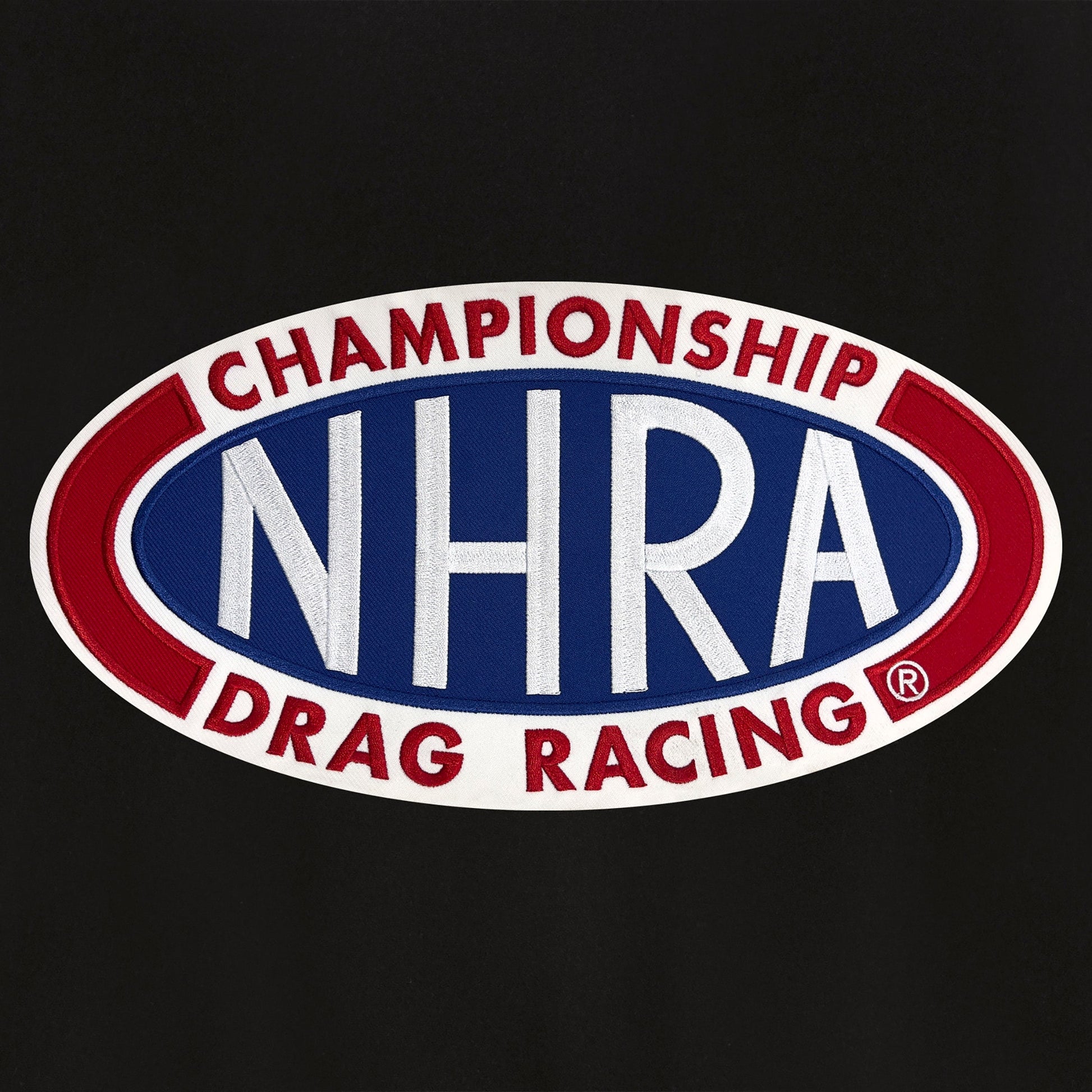 NHRA All Wool Jacket with nylon lining in black with embroidered logos. Assembled in the USA. 55% wool 45% polyester body. Snap button closure.