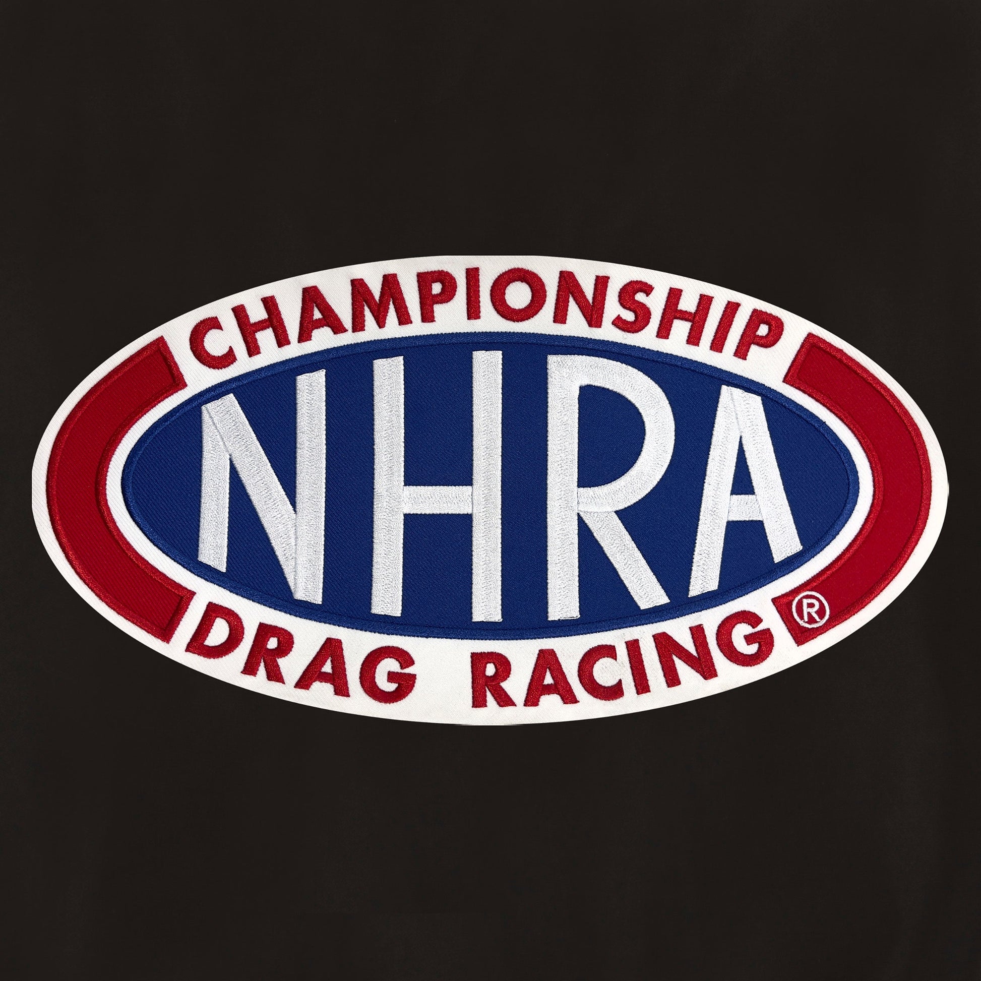 NHRA nylon bomber in black with embroidered logos. Assembled in the USA. 100% Nylon, full length zip front.