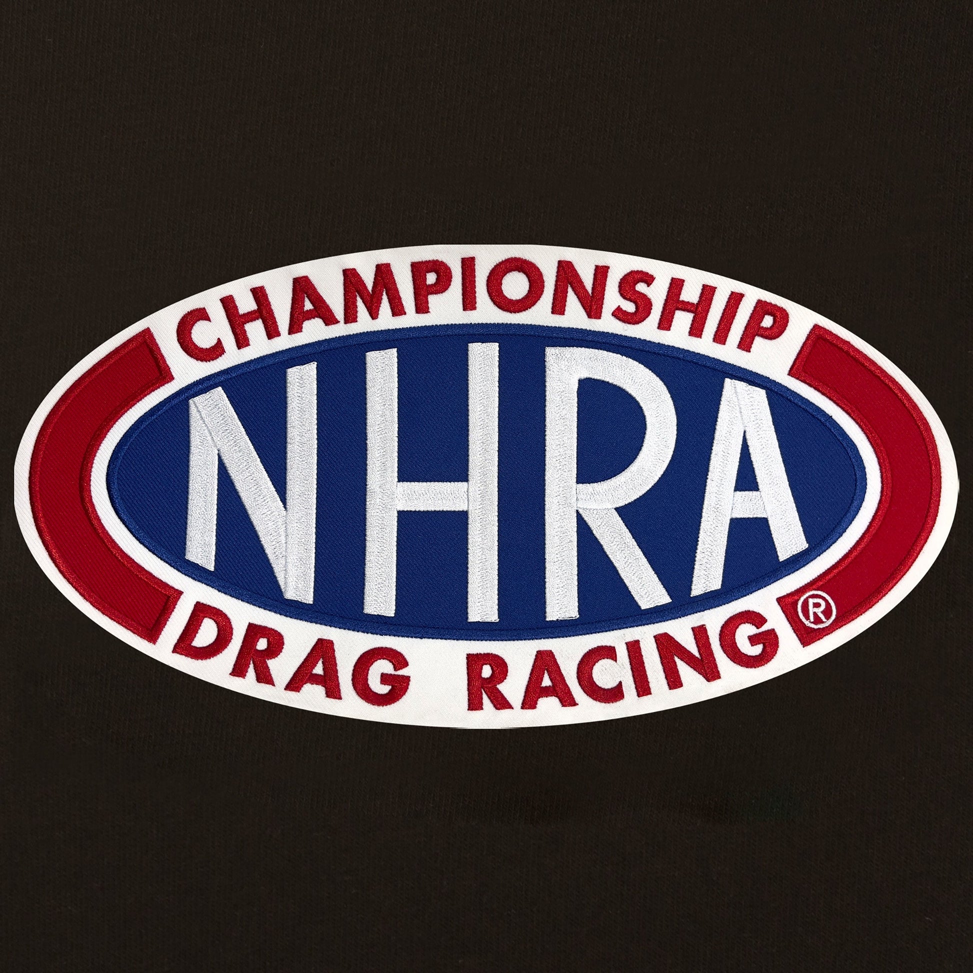 NHRA reversible fleece jacket with faux leather sleeves in black and white with embroidered logos. Assembled in the USA. 100% polyester body, faux leather sleeves, snap button closure.