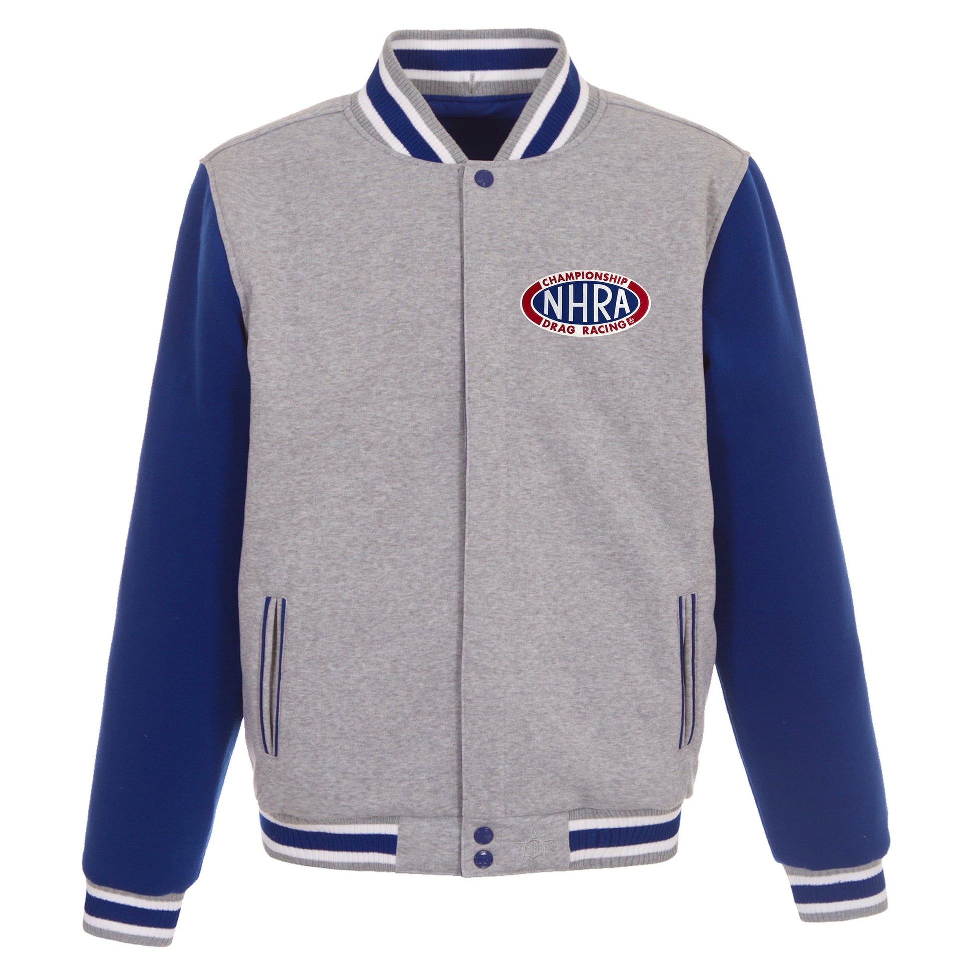 NHRA reversible two-tone fleece jacket in grey and royal with embroidered logos. Assembled in the USA. 100% polyester body, reverse nylon side, snap button closure.