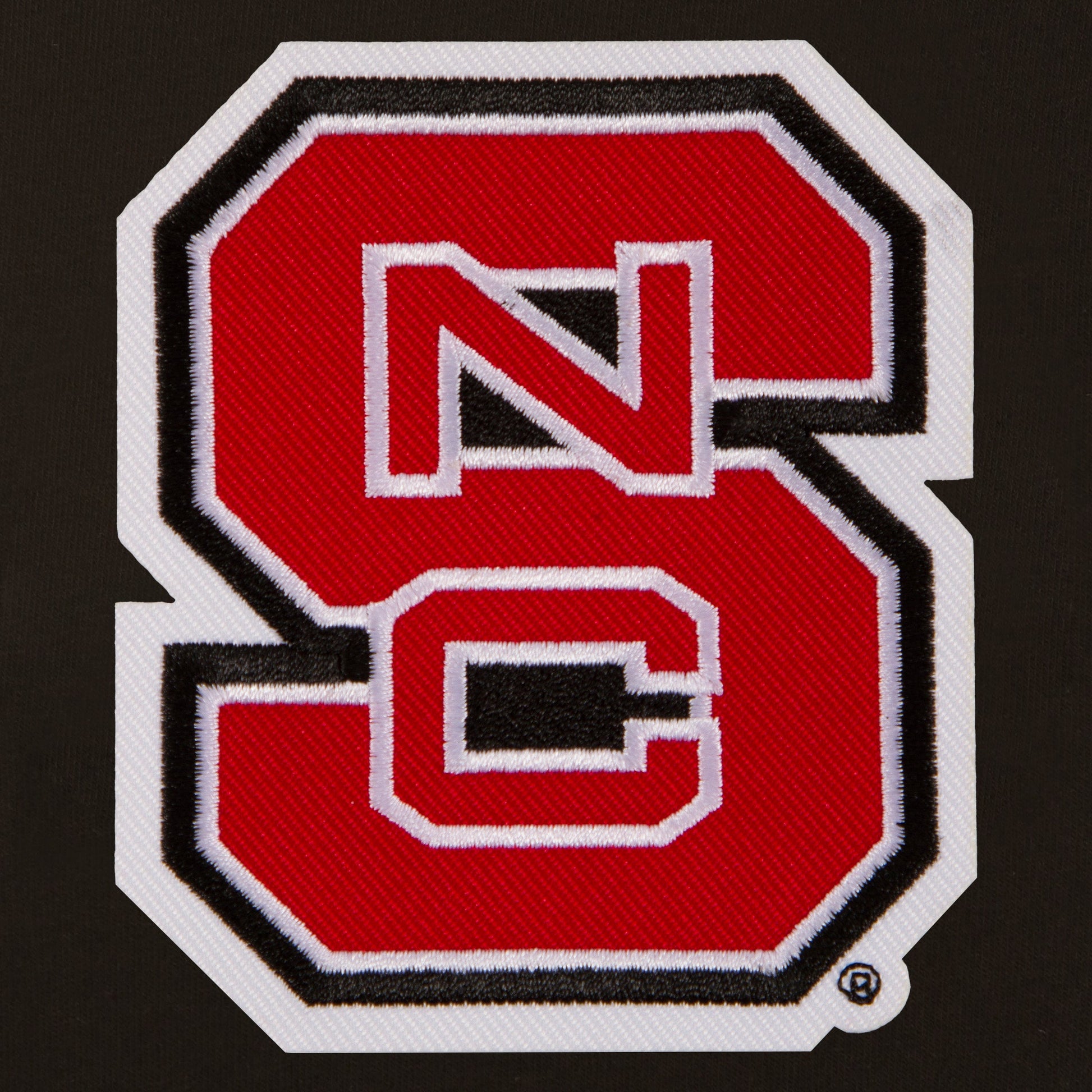 North Carolina State reversible fleece jacket with faux leather sleeves in black and white with embroidered logos. Assembled in the USA. 100% polyester body, faux leather sleeves, snap button closure.