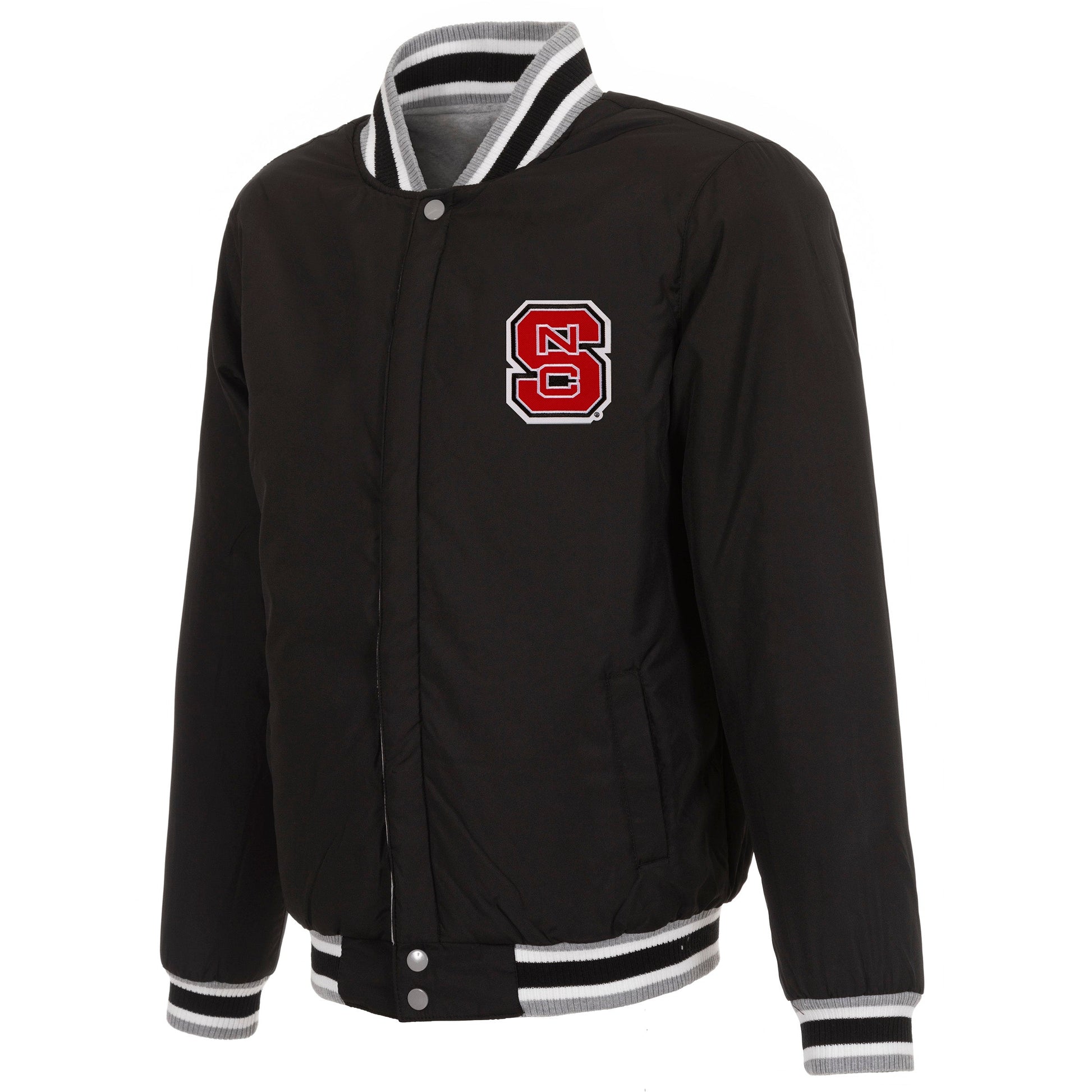 North Carolina State reversible two-tone fleece jacket in grey and black with embroidered logos. Assembled in the USA. 100% polyester body, reverse nylon side, snap button closure.