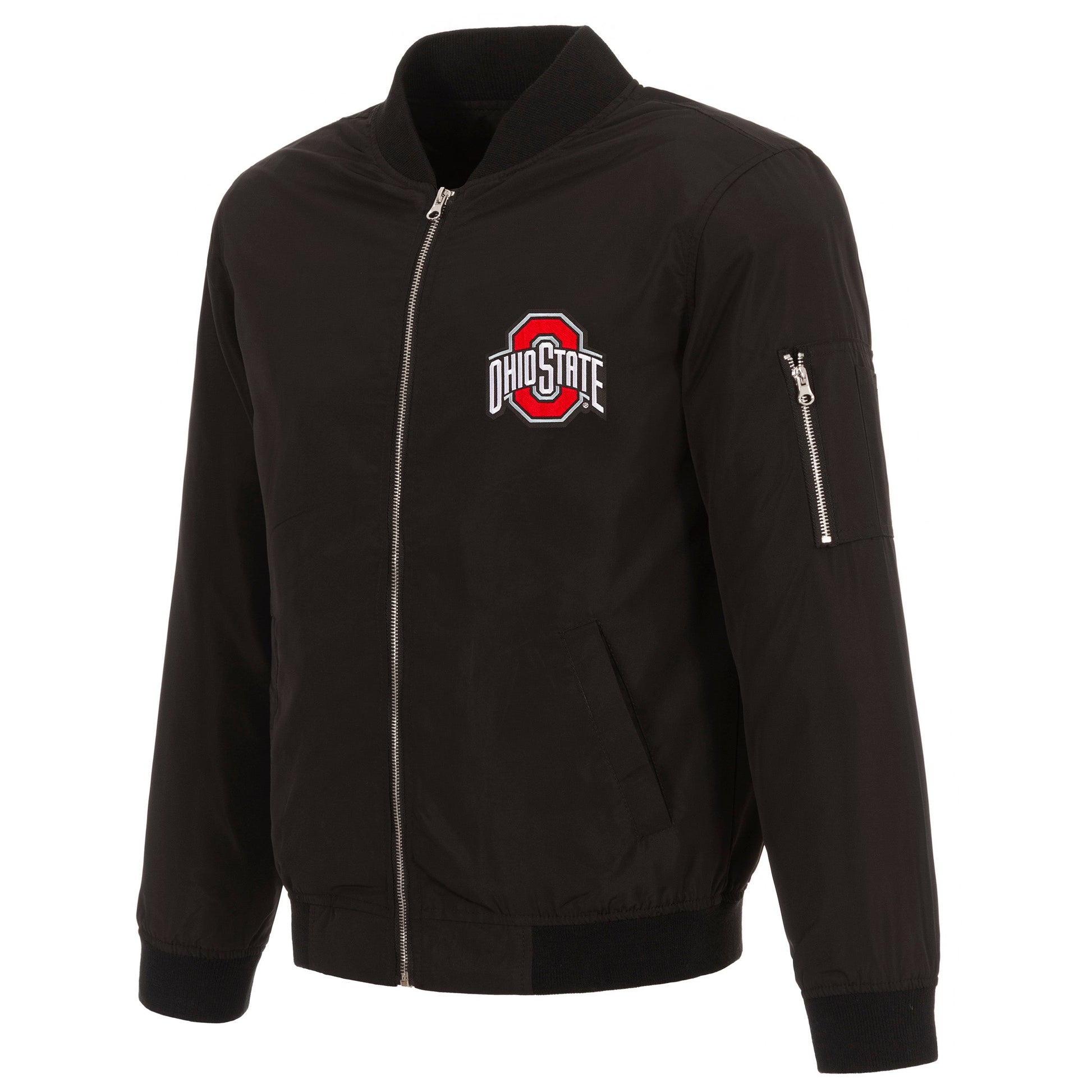 Ohio State University nylon bomber in black with embroidered logos. Assembled in the USA. 100% Nylon, full length zip front.
