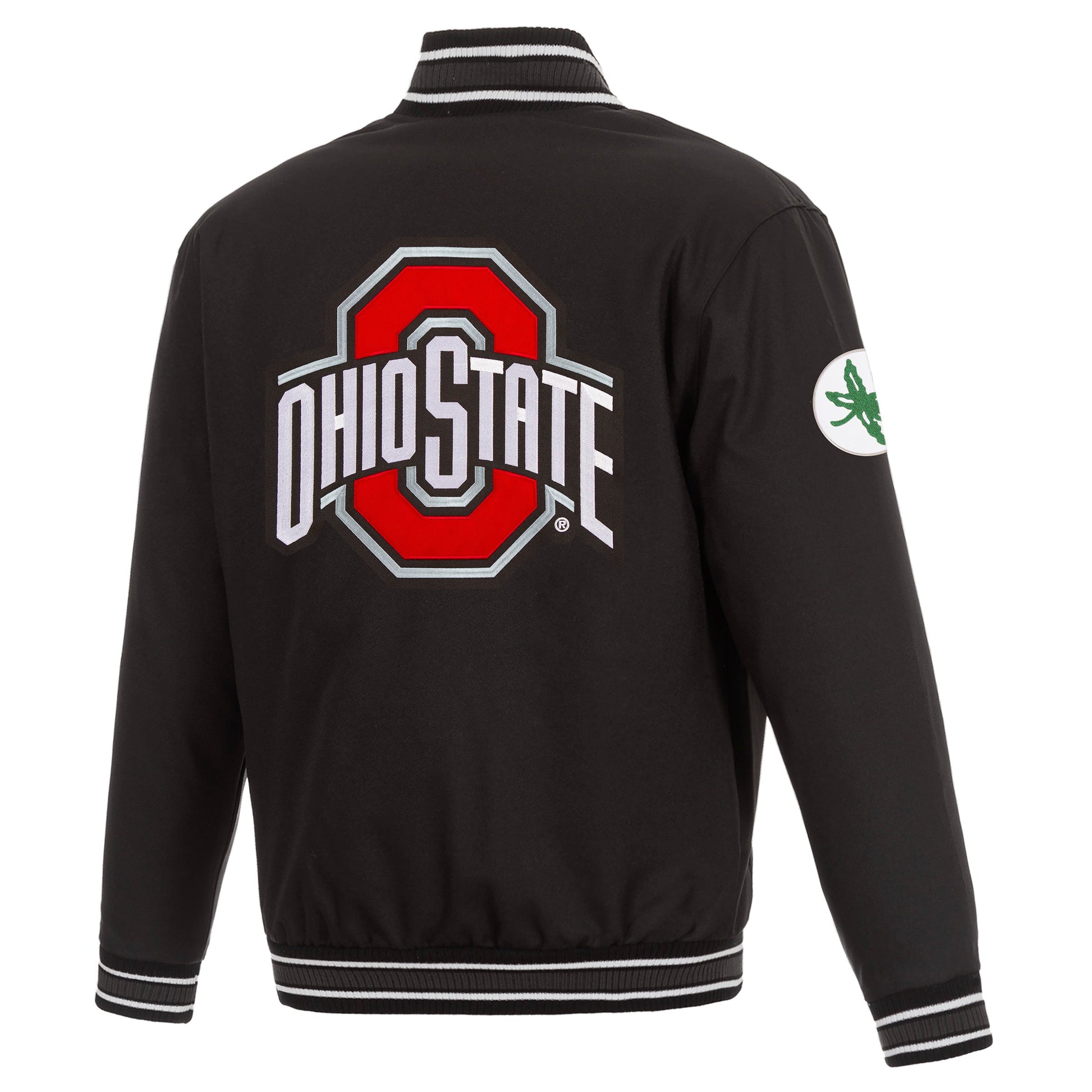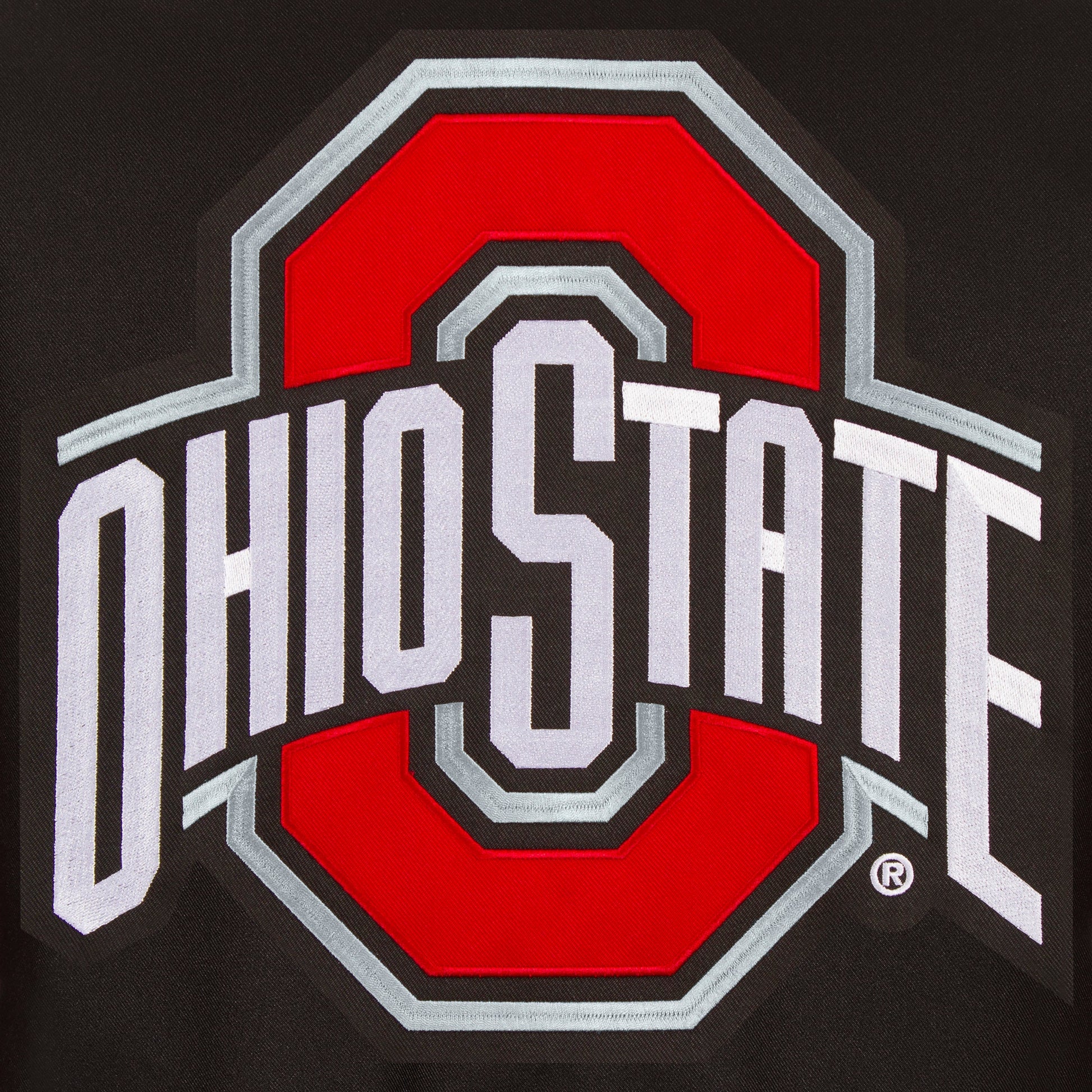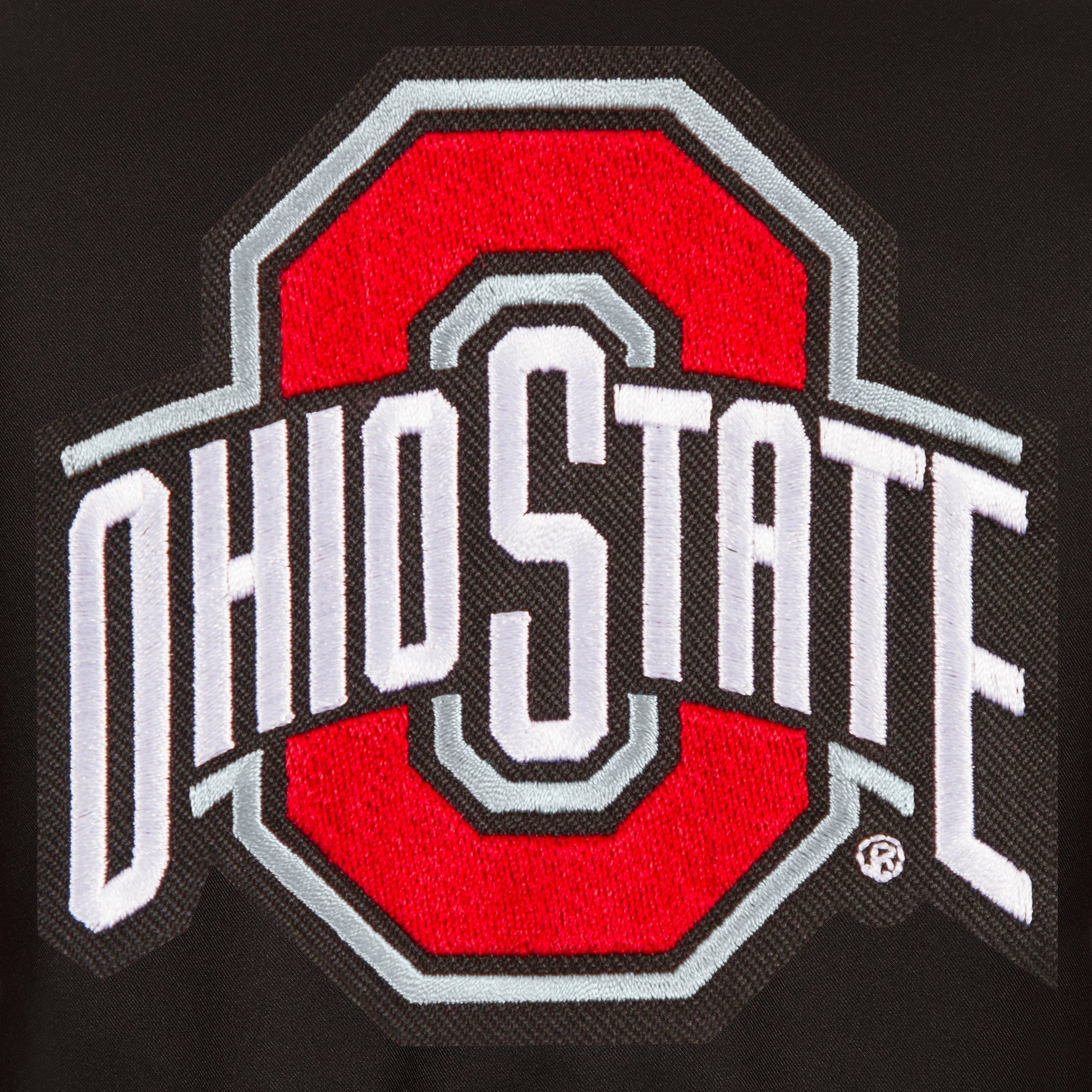 Ohio State University Poly-Twill Jacket with quilted nylon lining in black with embroidered logos. Assembled in the USA. 100% polyester body. Snap button closure.
