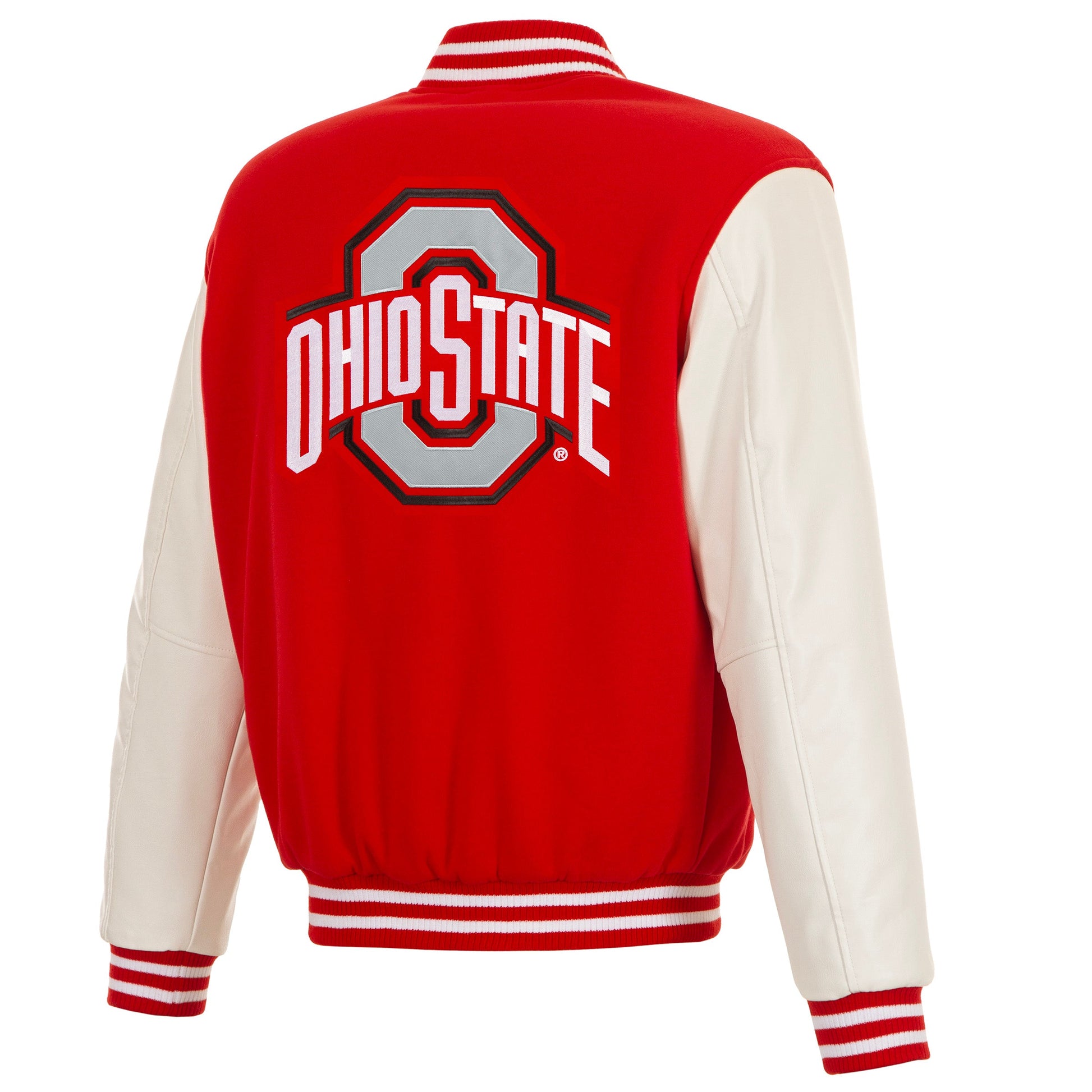 Ohio State University reversible fleece jacket with faux leather sleeves in red and white with embroidered logos. Assembled in the USA. 100% polyester body, faux leather sleeves, snap button closure.