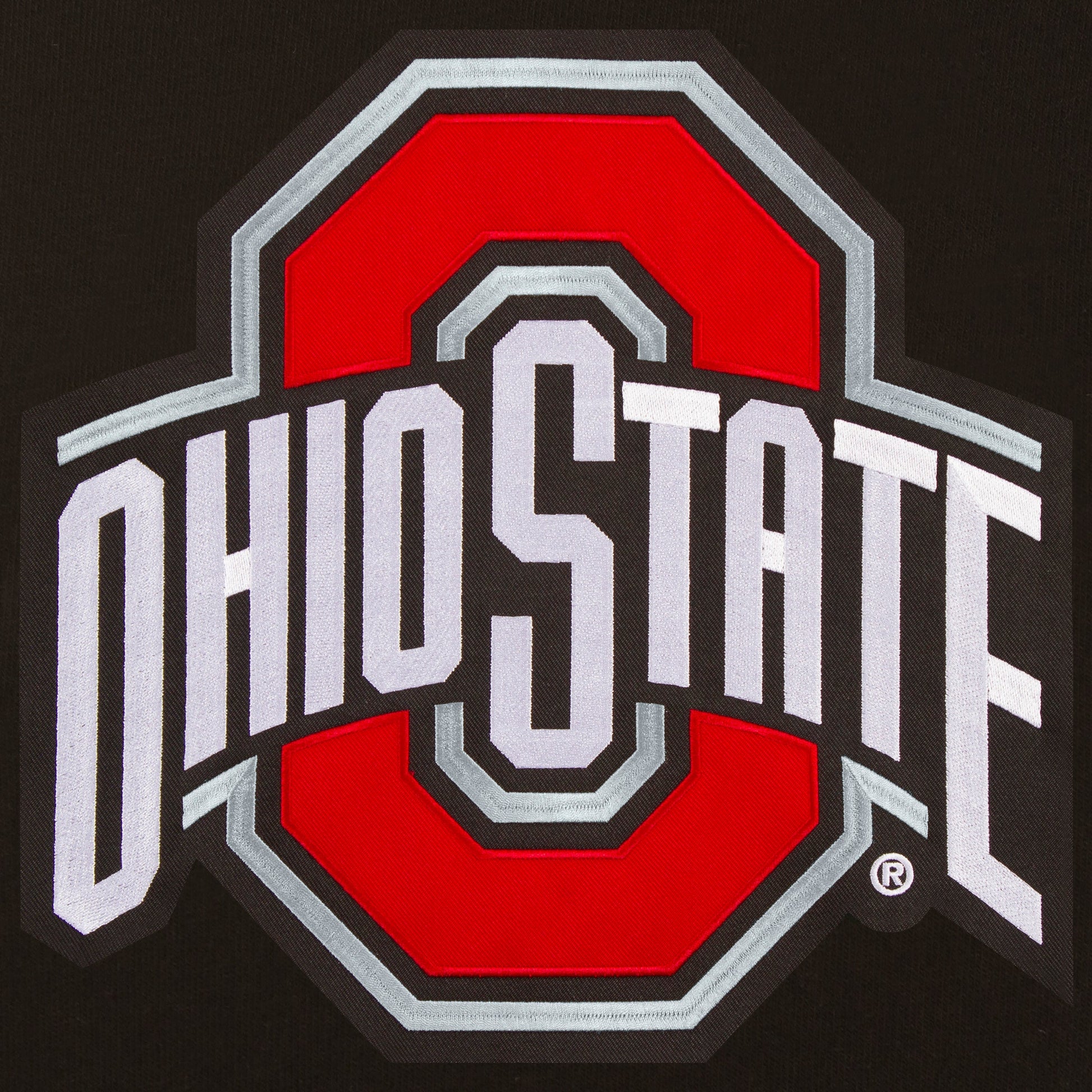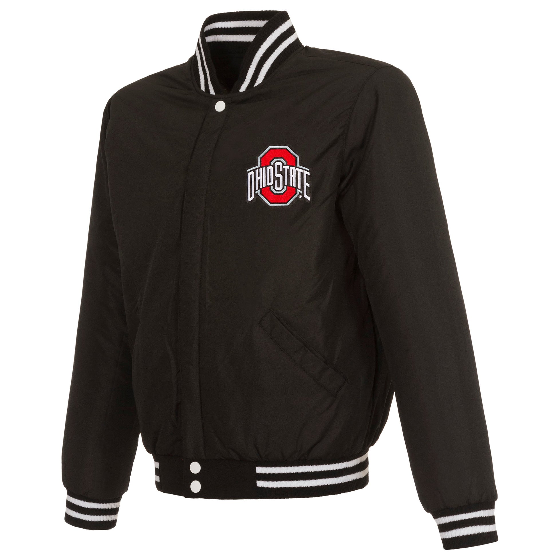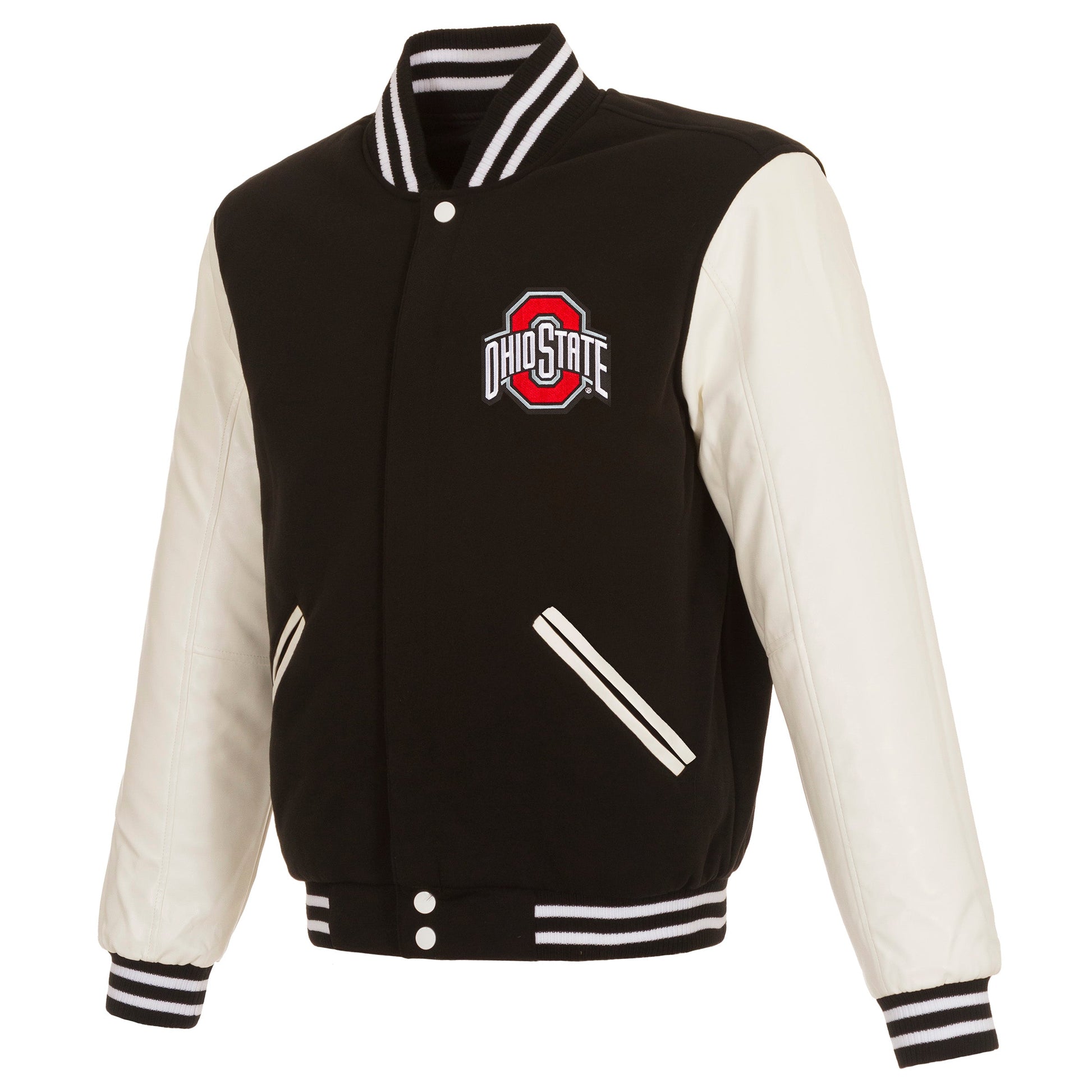 Ohio State University reversible fleece jacket with faux leather sleeves in black and white with embroidered logos. Assembled in the USA. 100% polyester body, faux leather sleeves, snap button closure.