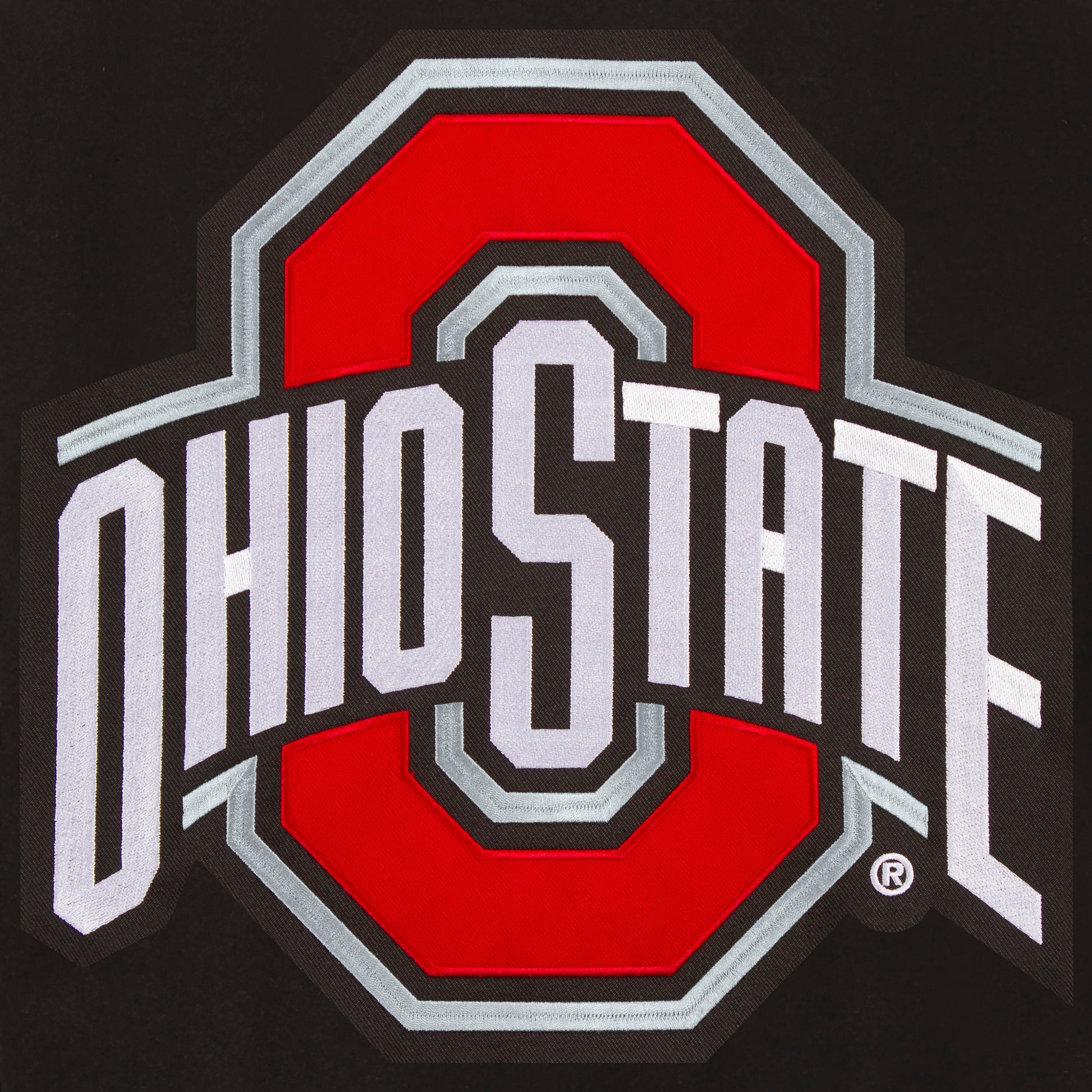 Ohio State University Reversible Wool and Leather Jacket with quilted nylon lining in black with embroidered logos. Assembled in the USA. 55% Wool 45% polyester body, 100% leather sleeves. Snap button closure.