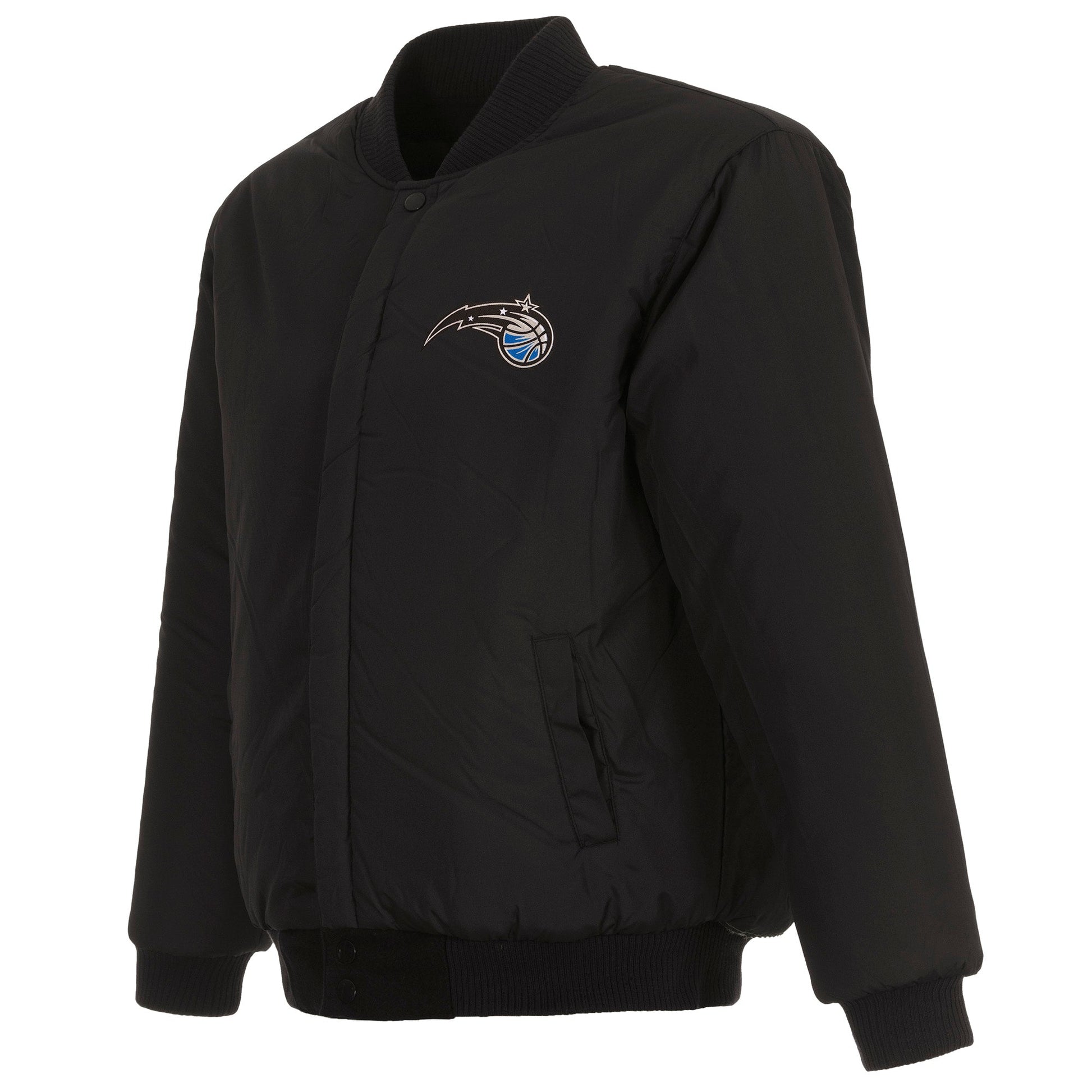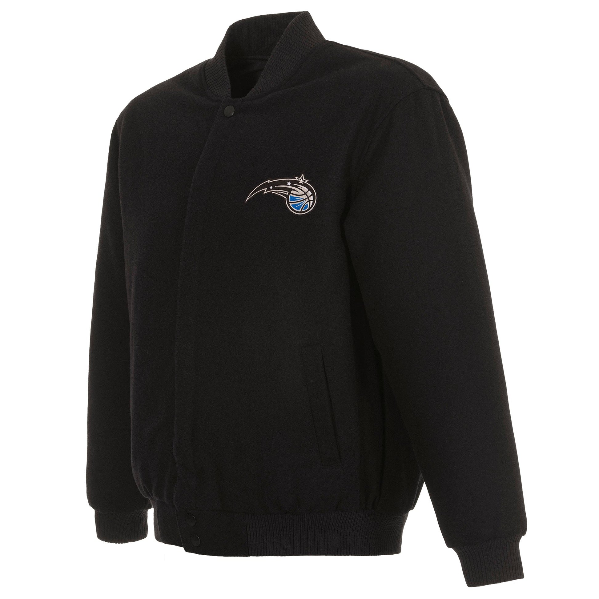 Orlando Magic All Wool Jacket with nylon lining in black with embroidered logos. Assembled in the USA. 55% wool 45% polyester body. Snap button closure.