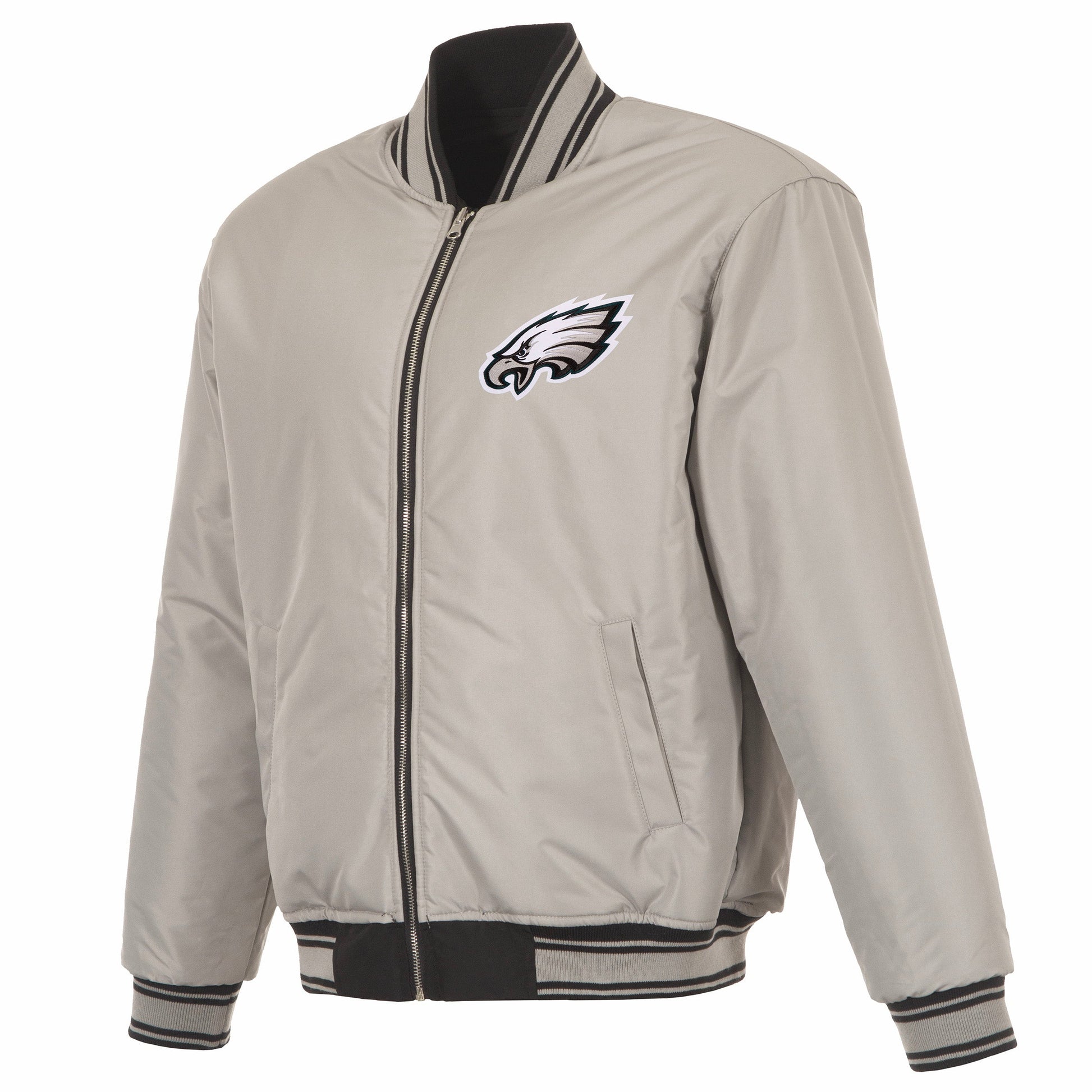 Philadelphia Eagles reversible nylon bomber in black and grey with embroidered logos. Assembled in the USA. 100% Nylon, full length zip front.