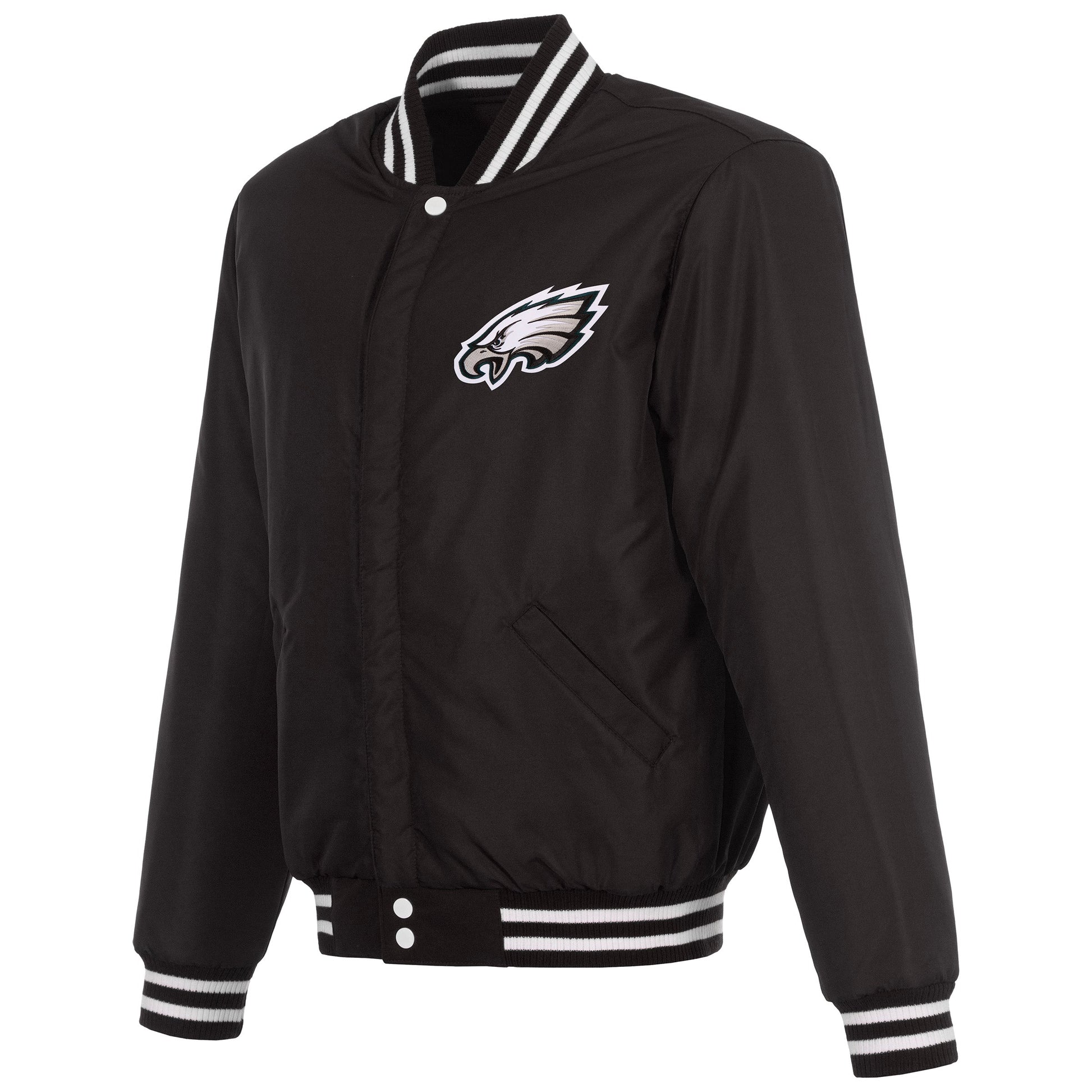 Philadelphia Eagles reversible fleece jacket with faux leather sleeves in black and white with embroidered logos. Assembled in the USA. 100% polyester body, faux leather sleeves, snap button closure.