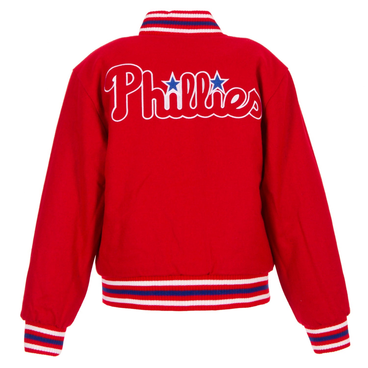 Philadelphia Phillies kid's reversible all wool jacket in red with nylon lining, embroidered logos and knit trim.
