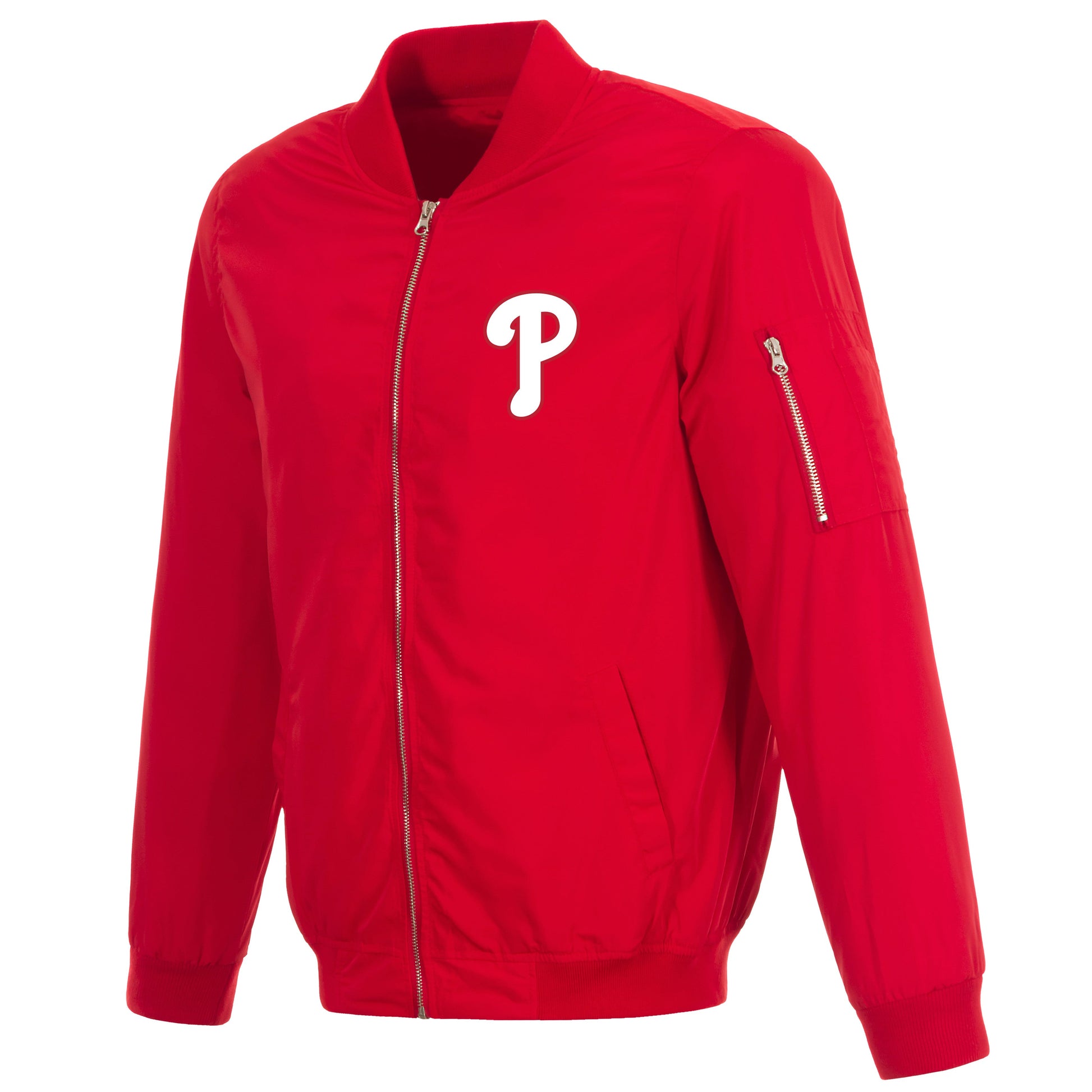 Philadelphia Phillies Nylon Bomber Jacket in red with embroidered logos. Assembled in the USA. 100% Nylon body, full length zip.