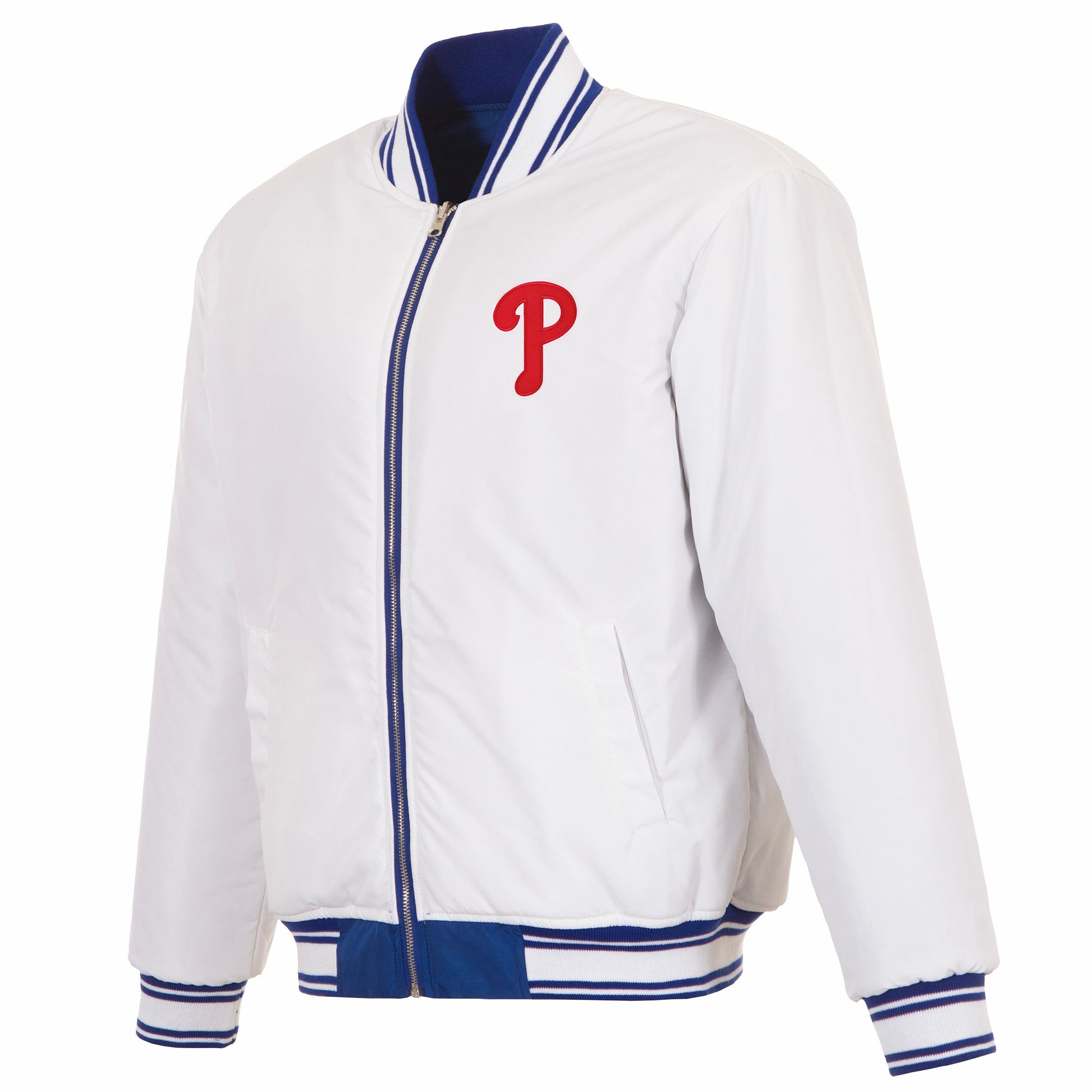Philadelphia Phillies reversible nylon bomber in royal and white with embroidered logos. Assembled in the USA. 100% Nylon, full length zip front.