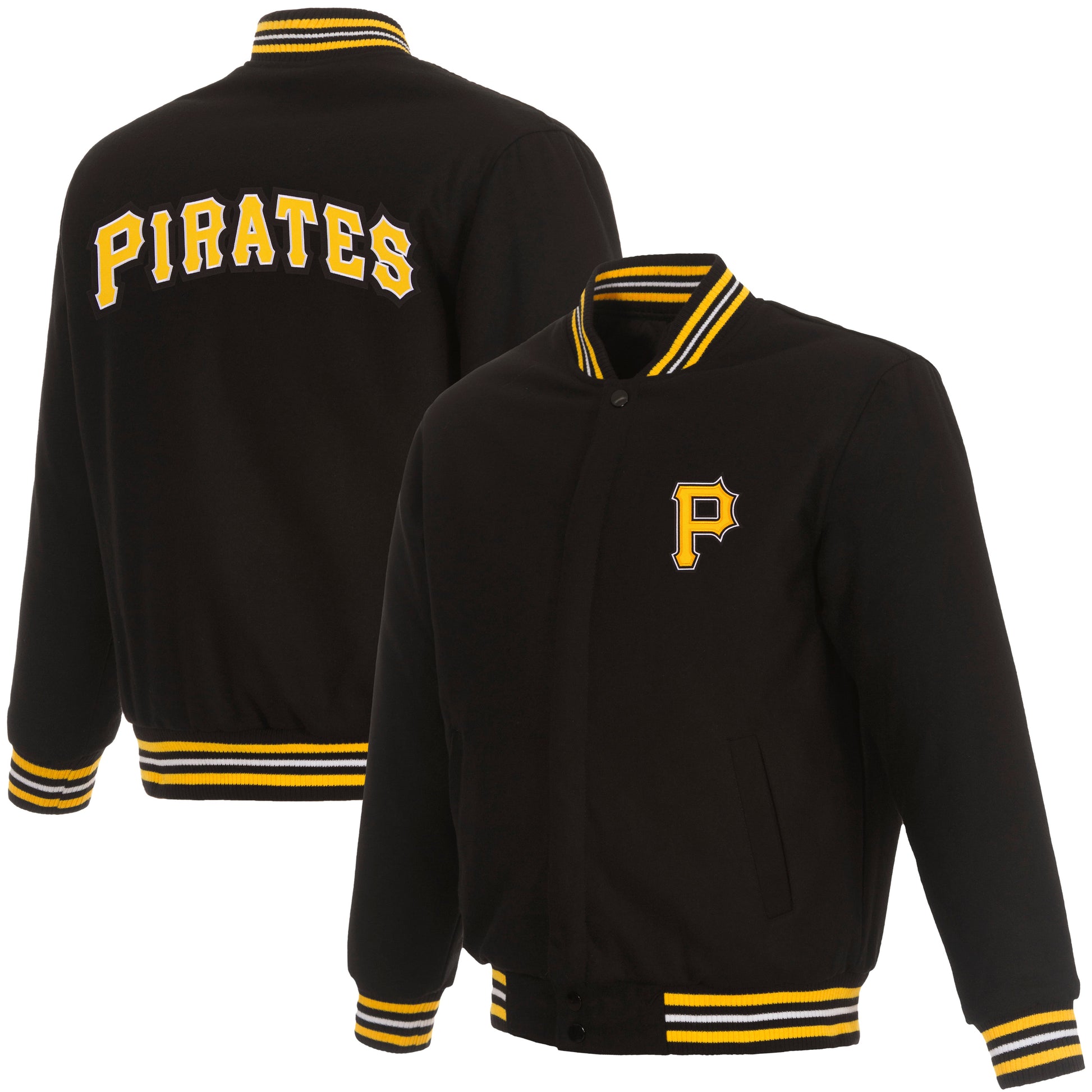 Pittsburgh Pirates All Wool Jacket with nylon lining in black and yellow with embroidered logos. Assembled in the USA. 55% wool 45% polyester body. Snap button closure.