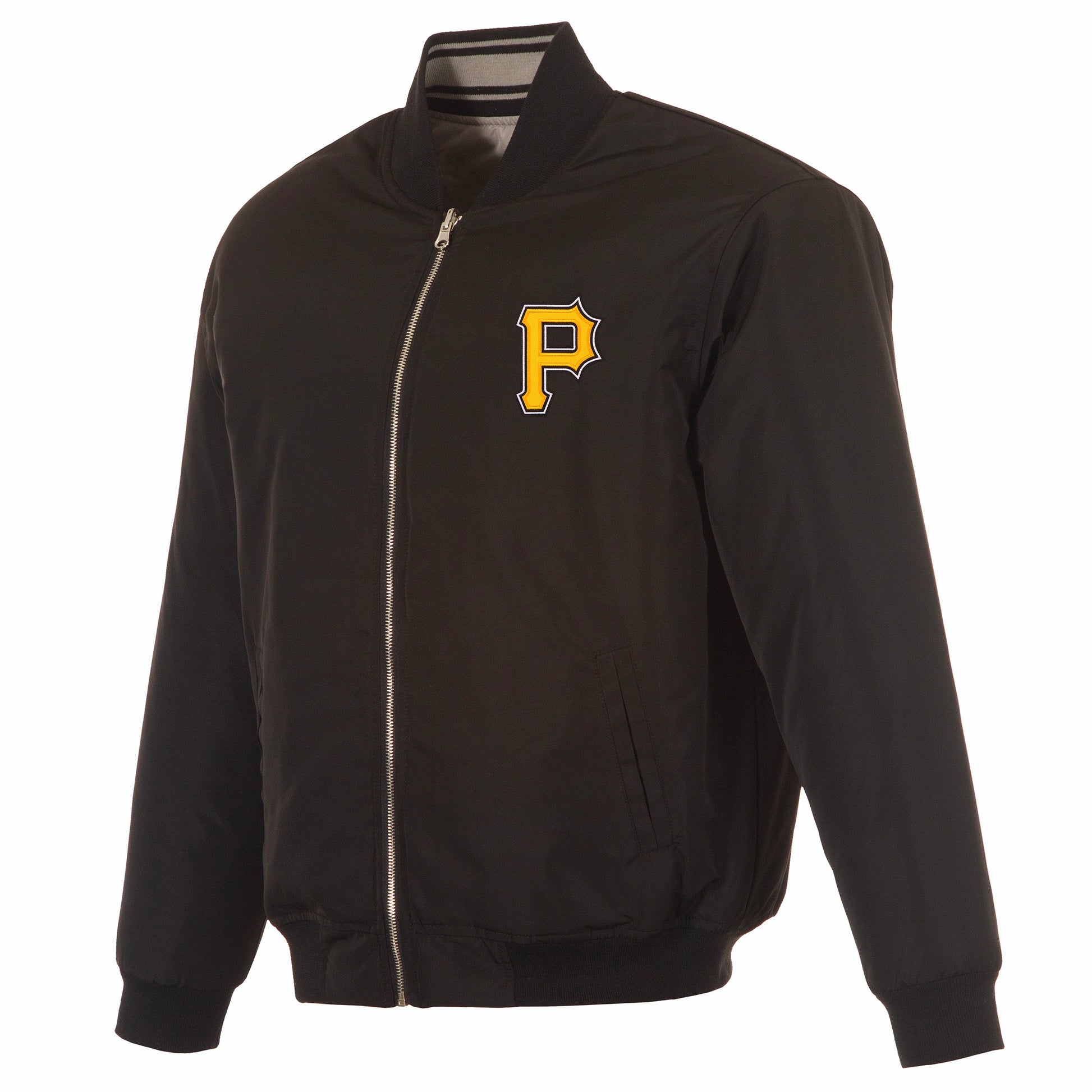 Pittsburgh Pirates reversible nylon bomber in black and grey with embroidered logos. Assembled in the USA. 100% Nylon, full length zip front.